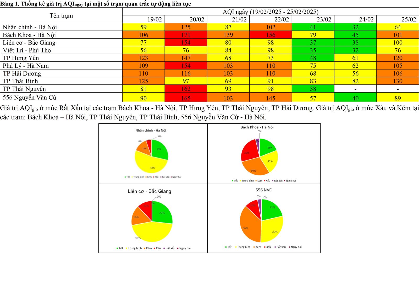 Kết quả quan trắc tại các trạm quan trắc tự động tại khu vực phía Bắc từ ngày 19/02 đến ngày 25/02 cho thấy chỉ số AQIngày ở mức xấu tại các trạm: Liên Cơ - Bắc Giang, Phủ Lý - Hà Nam, TP Thái Nguyên, 556 Nguyễn Văn Cừ, Bách Khoa - Hà Nội.