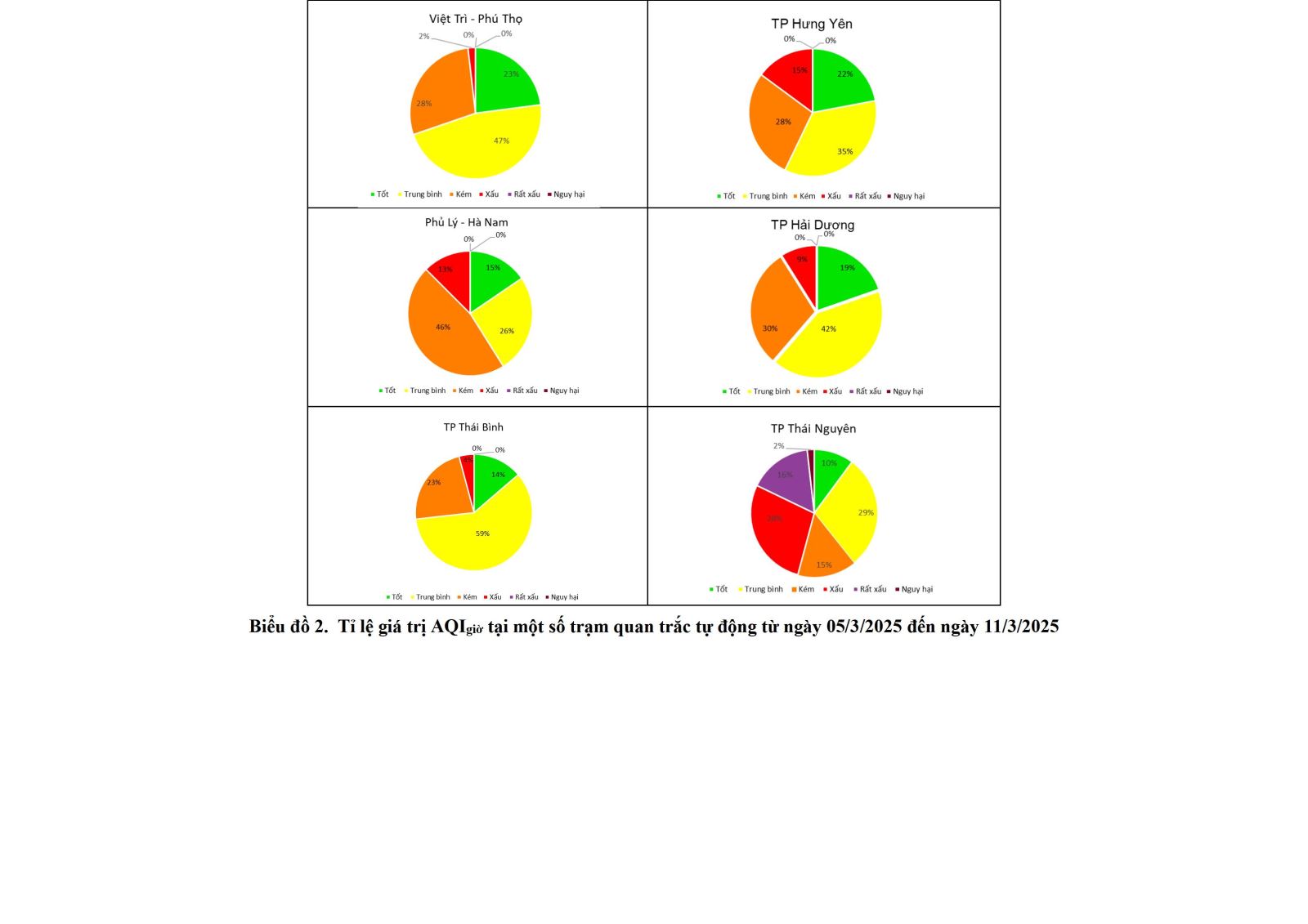 Kết quả quan trắc tại các trạm quan trắc tự động tại khu vực phía Bắc từ ngày 05/3 đến ngày 11/3 cho thấy chỉ số AQ Ingày ở mức Rất kém tại TP Thái Nguyên vào ngày 10/3. Chỉ số AQIngày ở mức xấu tại các trạm: Bách Khoa - Hà Nội, Liên cơ - Bắc Giang, TP Hải Duong, TP Thái Nguyên, 556 Nguyễn Văn Cừ.
