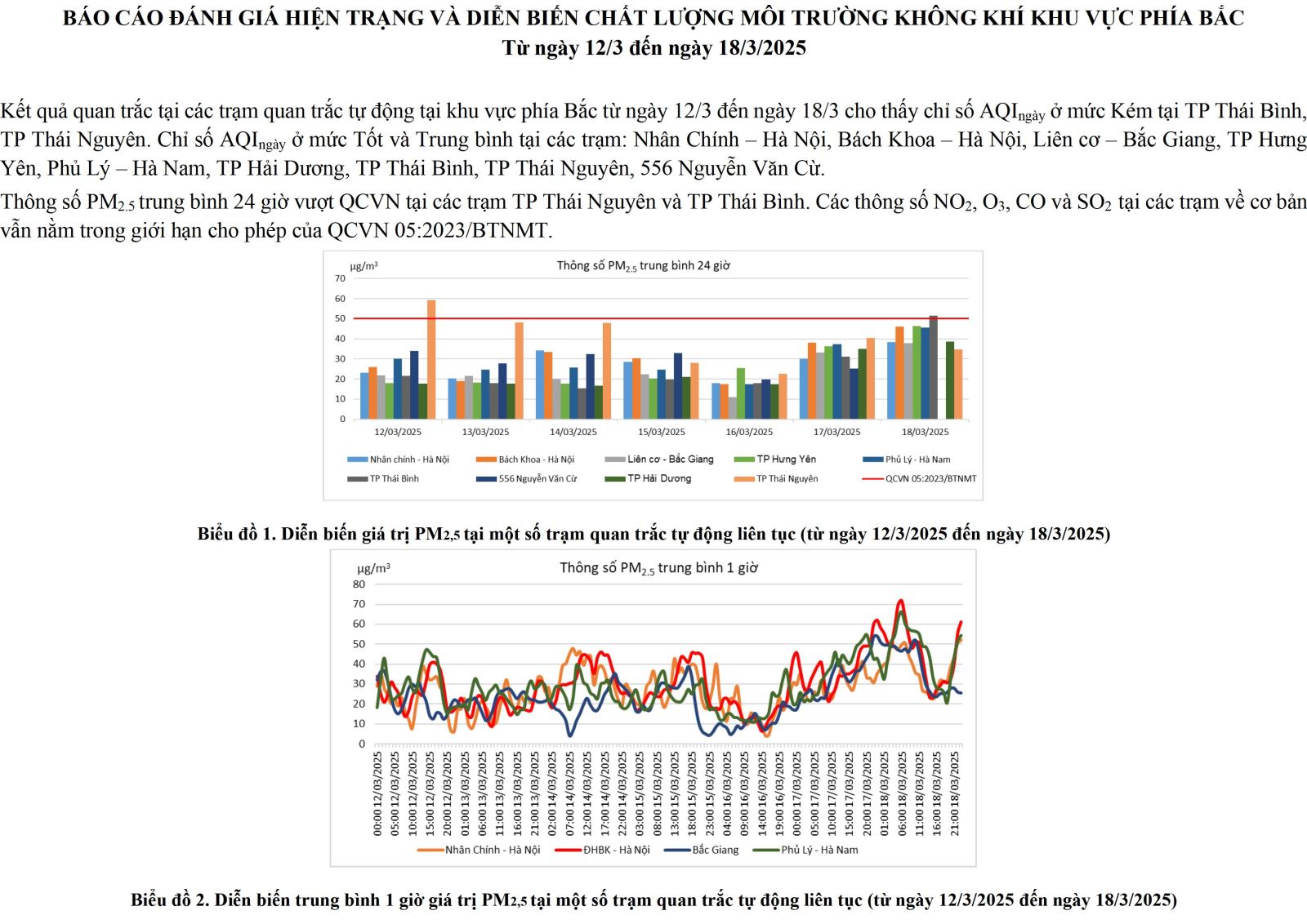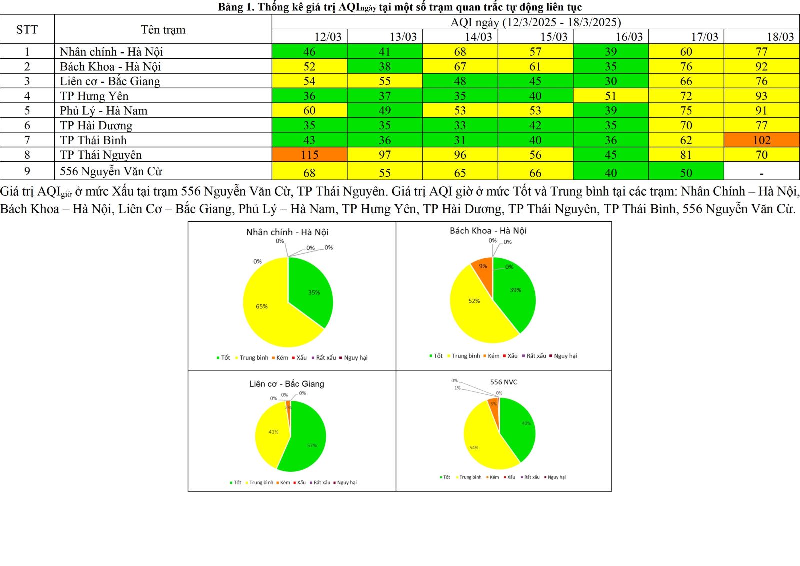Kết quả quan trắc tại các trạm quan trắc tự động tại khu vực phía Bắc từ ngày 12/3 đến ngày 18/3 cho thấy chỉ số AQIngày ở mức Kém tại TP Thái Bình, TP Thái Nguyên. Chỉ số AQIngày ở mức Tốt và Trung bình tại các trạm: Nhân Chính - Hà Nội, Bách Khoa - Hà Nội, Liên cơ - Bắc Giang, TP Hung Yên, Phủ Lý - Hà Nam, TP Hải Duong, TP Thái Bình, TP Thái Nguyên, 556 Nguyễn Văn Cừ.
