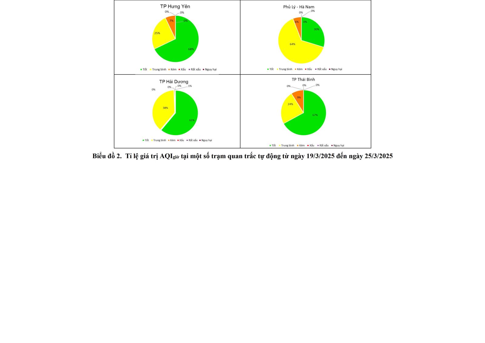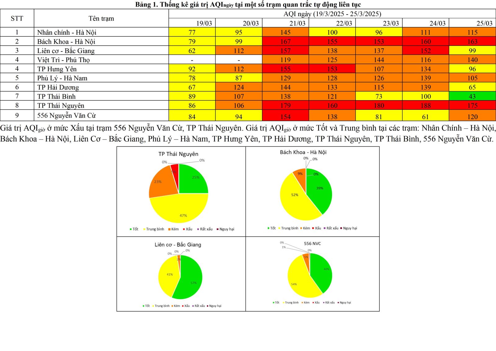 Kết quả quan trắc tại các trạm quan trắc tự động tại khu vực phía Bắc từ ngày 19/3 đến ngày 25/3 cho thấy chỉ số AQIngày ở mức Kém tại TP Thái Bình, TP Thái Nguyên, Nhân Chính - Hà Nội, Bách Khoa - Hà Nội, Liên cơ - Bắc Giang, TP Hung Yên, Phủ Lý - Hà Nam, TP Hải Duong, TP Thái Bình, TP Thái Nguyên, 556 Nguyễn Văn Cừ.