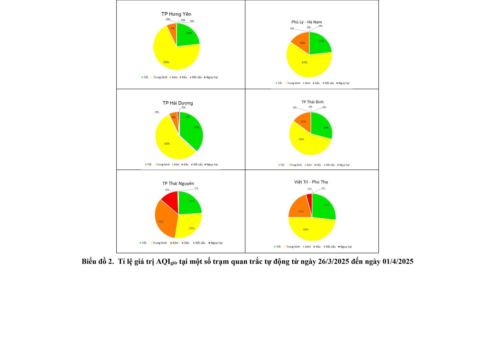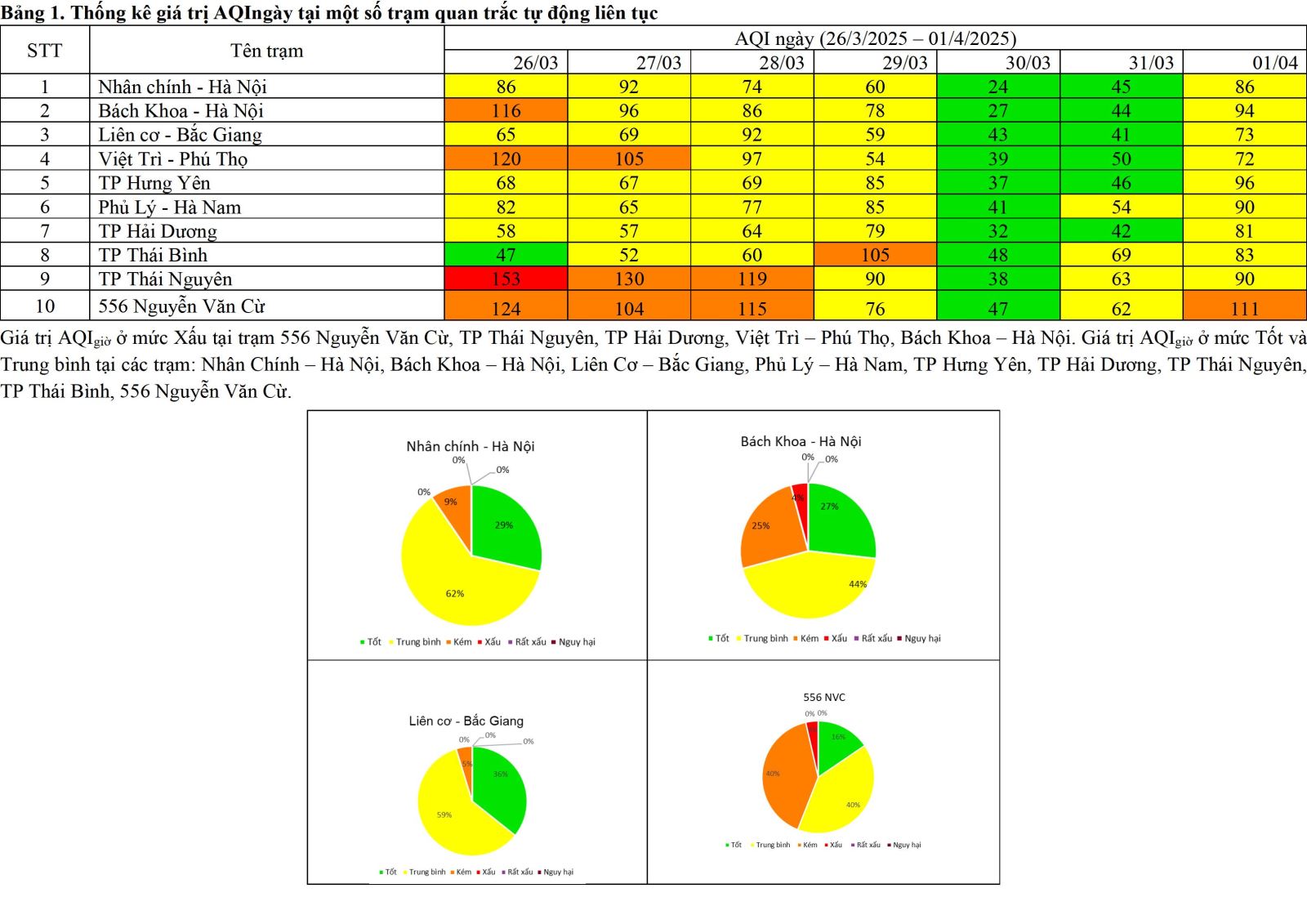Kết quả quan trắc tại các trạm quan trắc tự động tại khu vực phía Bắc từ ngày 26/3 đến ngày 01/4 cho thấy chỉ số AQIngày ở mức xấu tại TP Thái Nguyên. Chỉ số AQIngày ở Kém tại các trạm Bách Khoa - Hà Nội, Việt Trì - Phú Thọ, TP Thái Bình, TP Thái Nguyên, 556 Nguyễn Văn Cừ. Các trạm còn lại đang ở mức Tốt và Trung bình.
