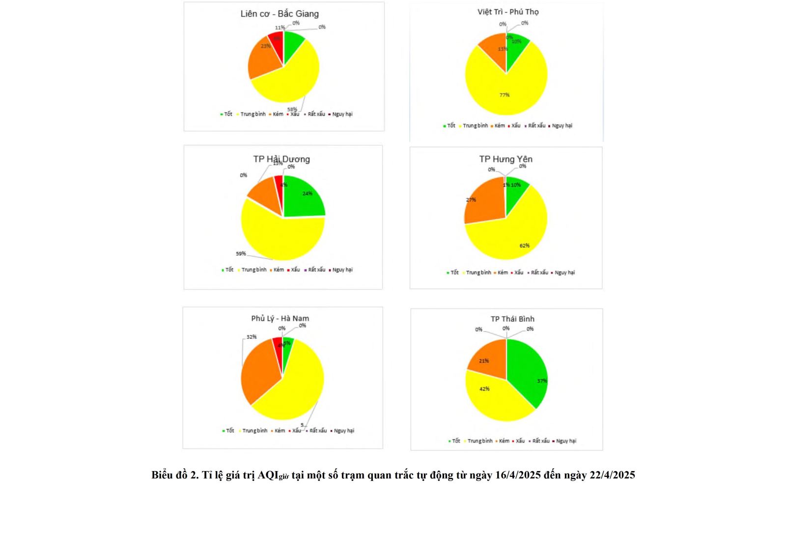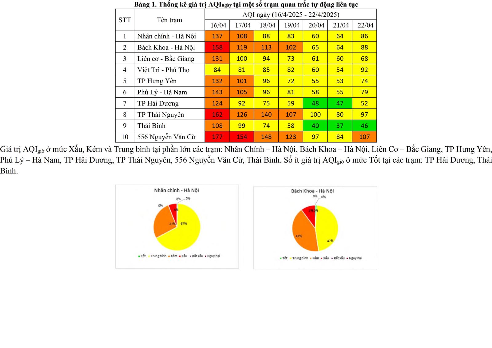 Kết quả quan trắc tại các trạm quan trắc tự động tại khu vực phía Bắc từ ngày 16/4 đến ngày 22/4 cho thấy chỉ số AQIngày ở mức Xấu tại 03 trạm: TP Thái Nguyên, Bách Khoa – Hà Nội, 556 Nguyễn Văn Cừ. Chỉ số AQIngày ở mức Kém và Trung bình tại phần lớn các trạm 06 trạm: Nhân Chính – Hà Nội, , Liên Cơ – Bắc Giang, Việt Trì – Phú Thọ, TP Hưng Yên, Phủ Lý – Hà Nam, TP Hải Dương, TP Thái Nguyên, Thái Bình, 556 Nguyễn Văn Cừ.