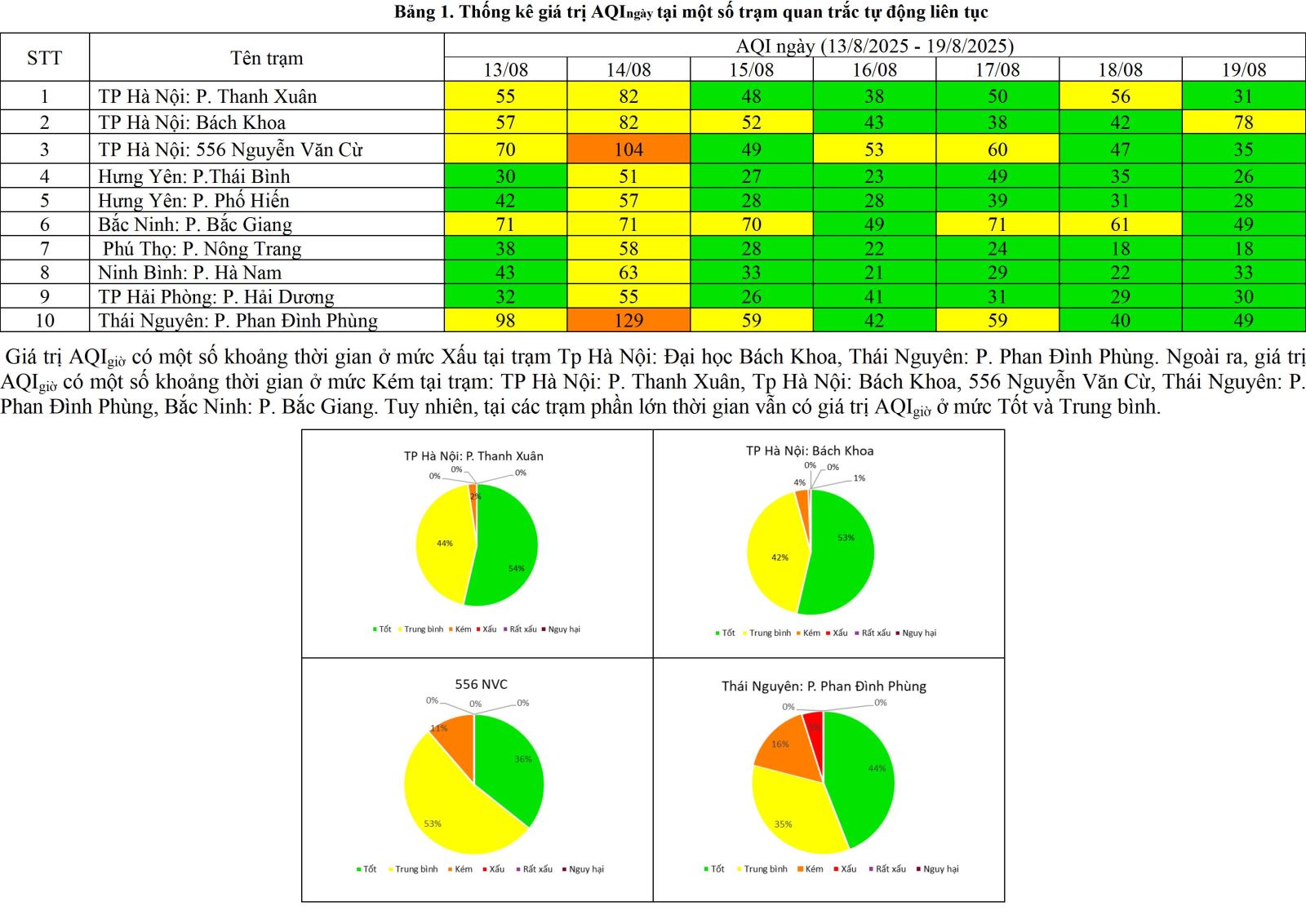 Kết quả quan trắc tại các trạm quan trắc tự động khu vực phía Bắc từ ngày 13/8 đến ngày 19/8 cho thấy chỉ số AQIngày ở mức Kém tại 02 trạm: Hà Nội: 556 Nguyễn Văn Cừ, Thái Nguyên: P. Phan Đình Phùng. Tại các trạm khác chỉ số AQIngày duy trì ở mức Tốt và Trung bình.