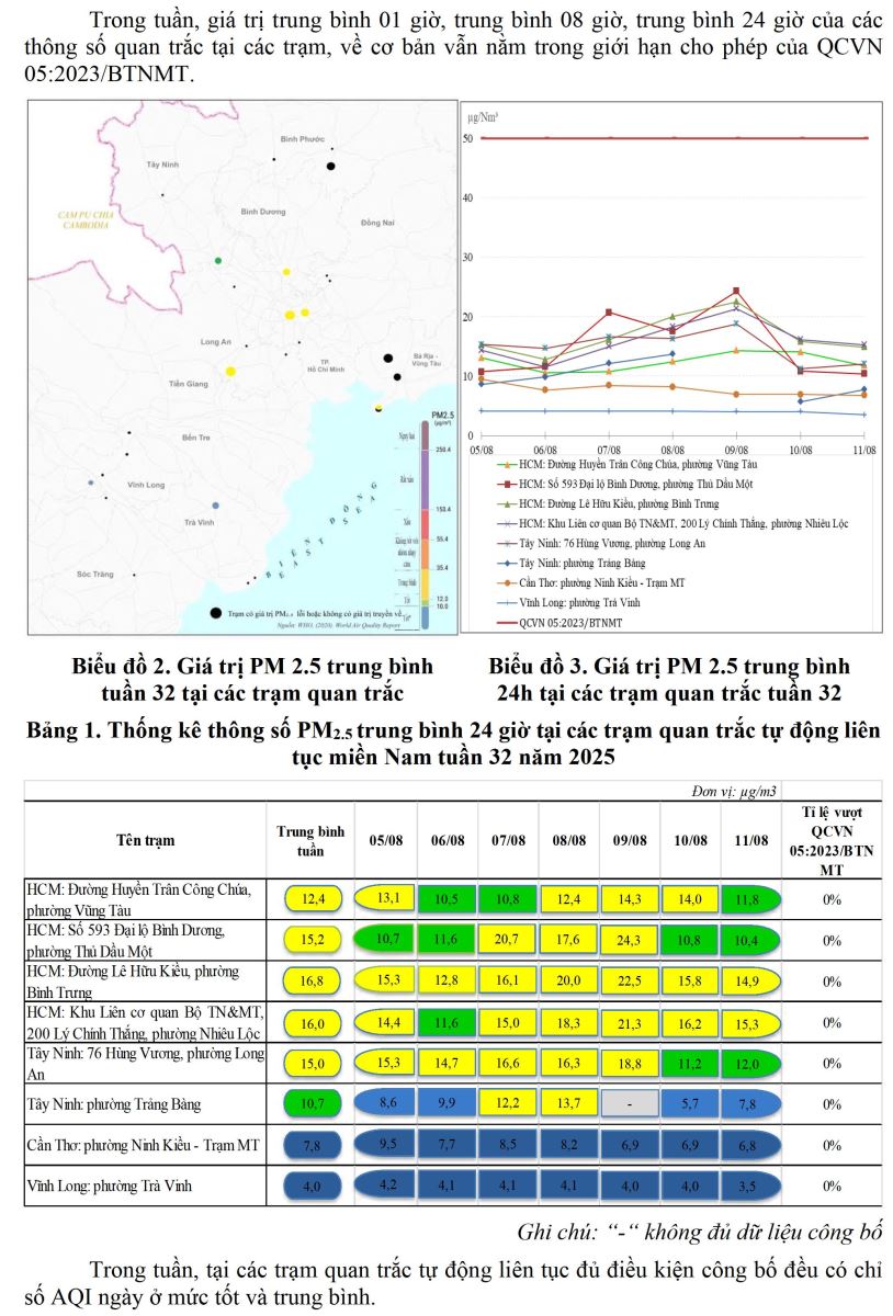 BÁO CÁO DIỄN BIẾN CHẤT LƯỢNG MÔI TRƯỜNG KHÔNG KHÍ XUNG QUANH KHU VỰC MIỀN NAM Tuần 32 (Từ ngày 05/8/2025 đến ngày 11/8/2025)