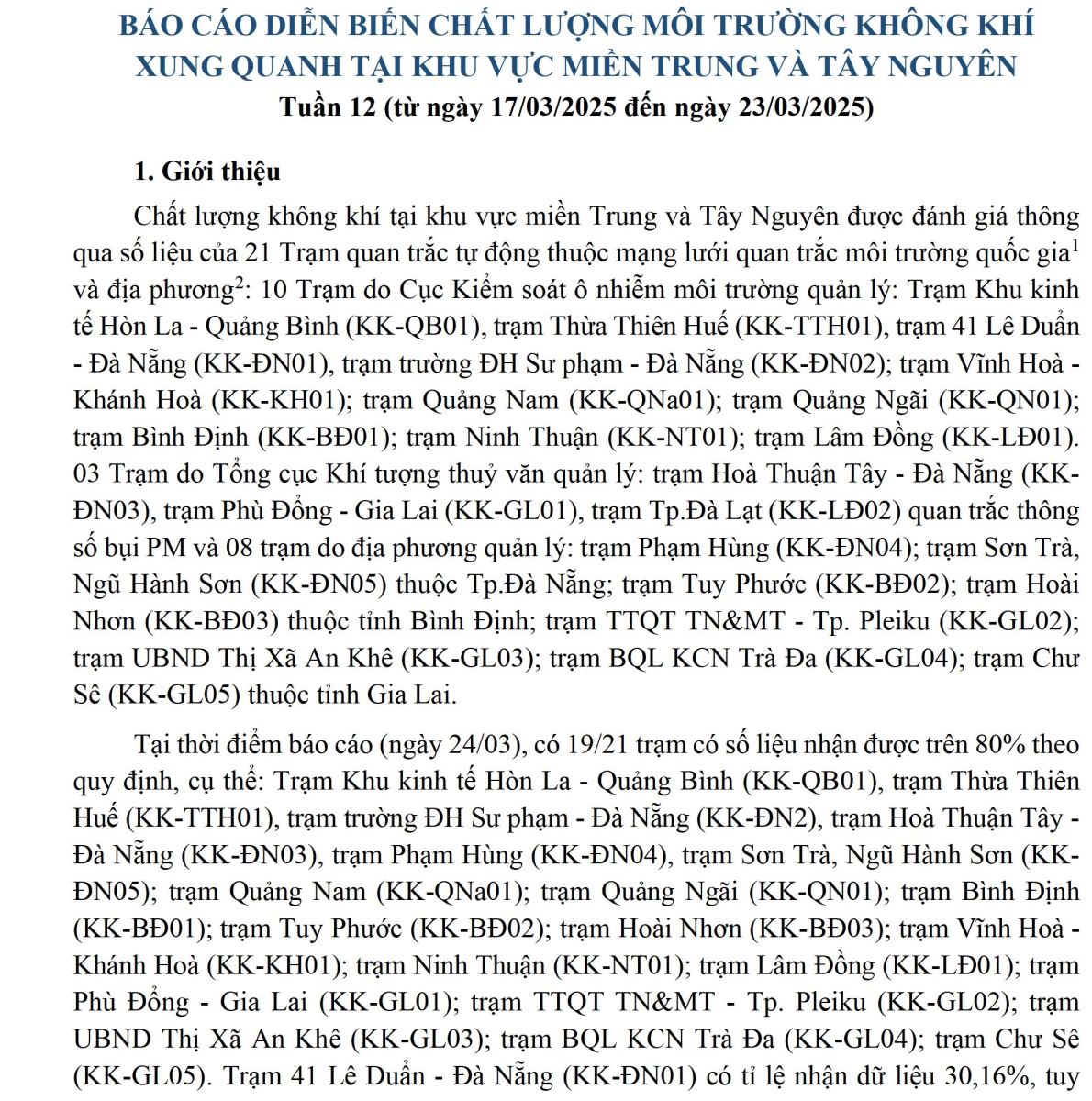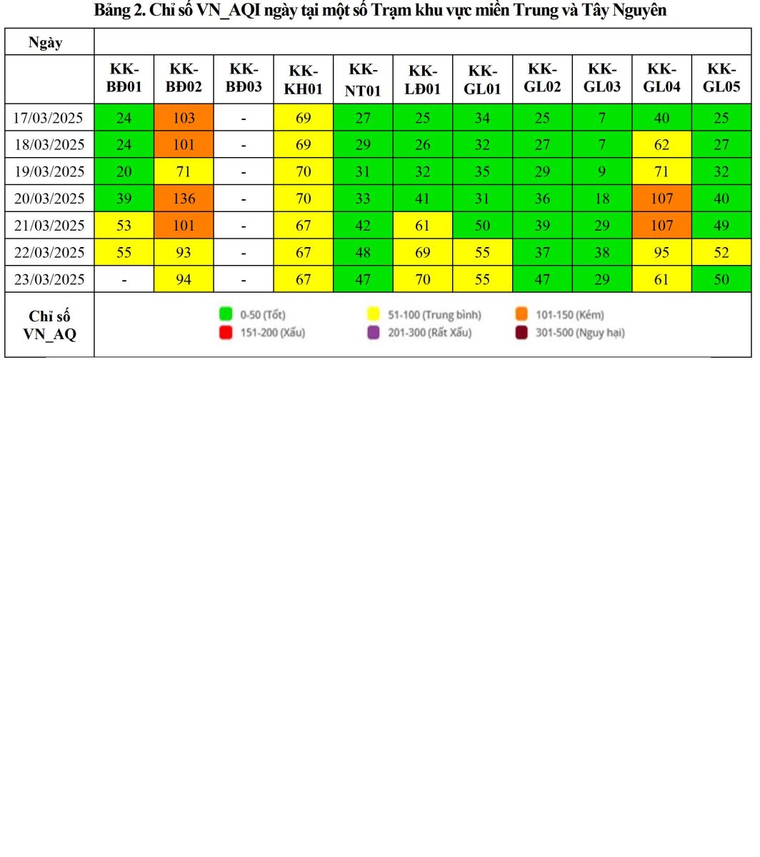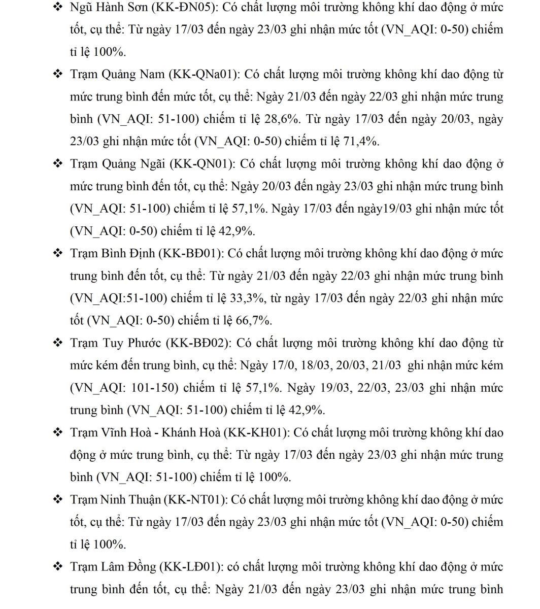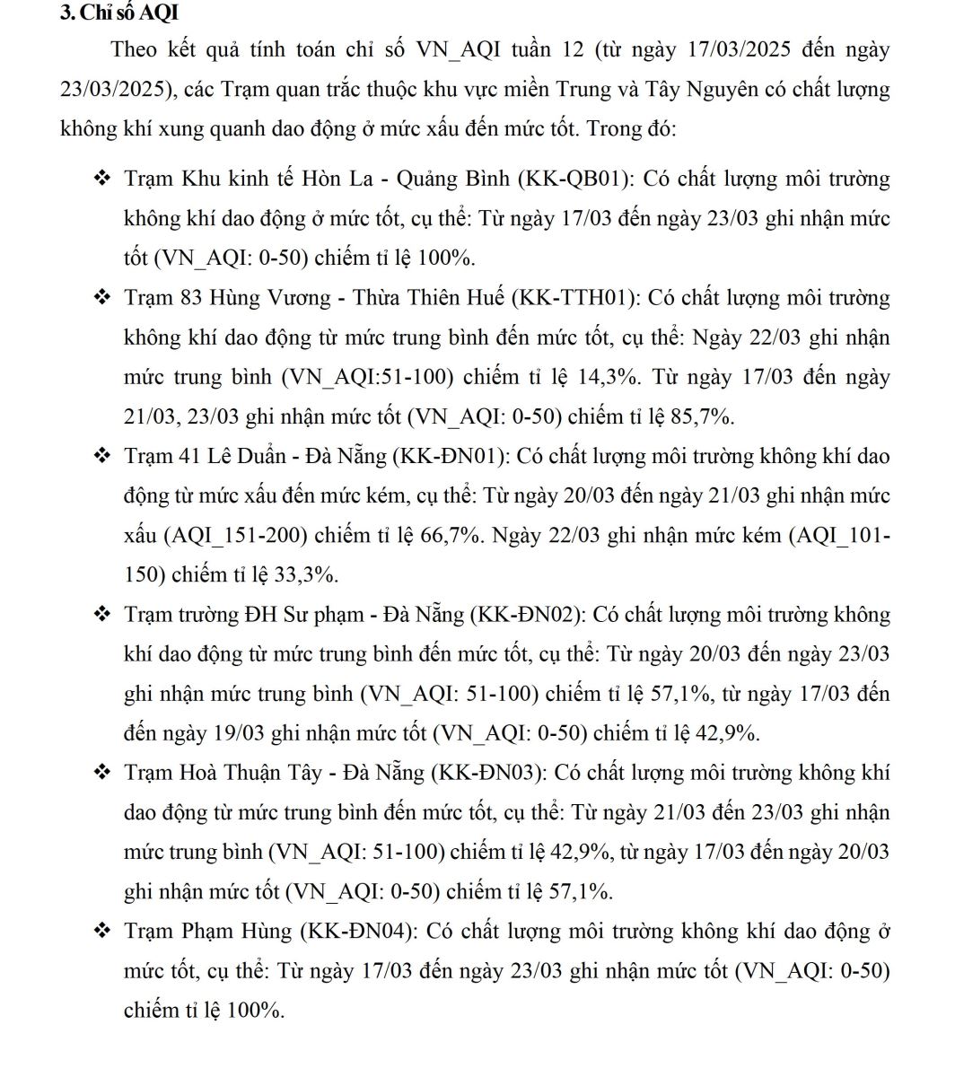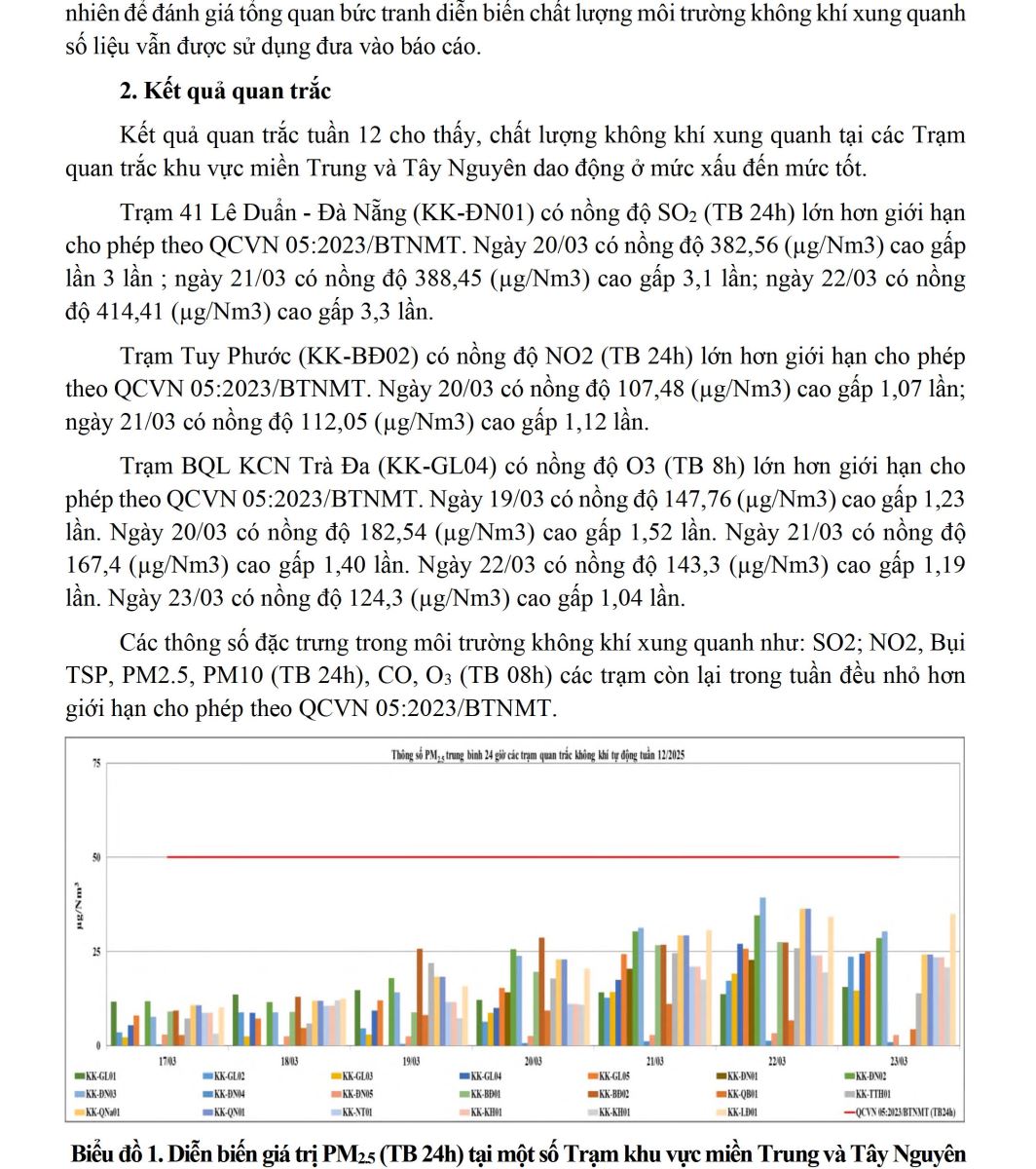 BÁO CÁO DIỄN BIẾN CHẤT LƯỢNG MÔI TRƯỜNG KHÔNG KHÍ XUNG QUANH TẠI KHU VỰC MIỀN TRUNG VÀ TÂY NGUYÊN Tuần 12 (từ ngày 17/03/2025 đến ngày 23/03/2025)