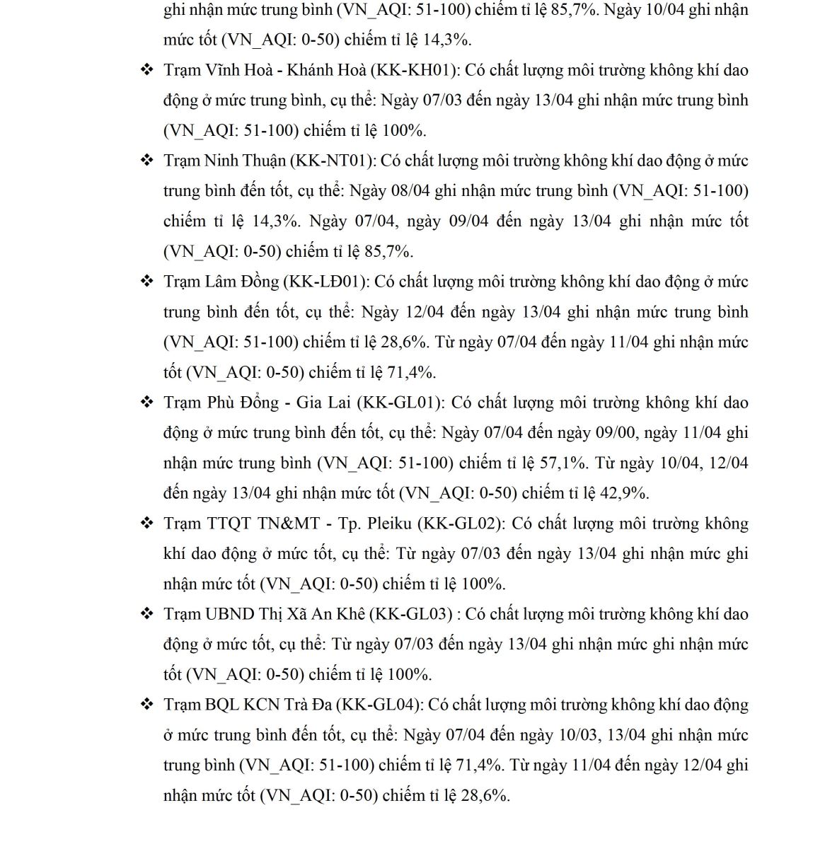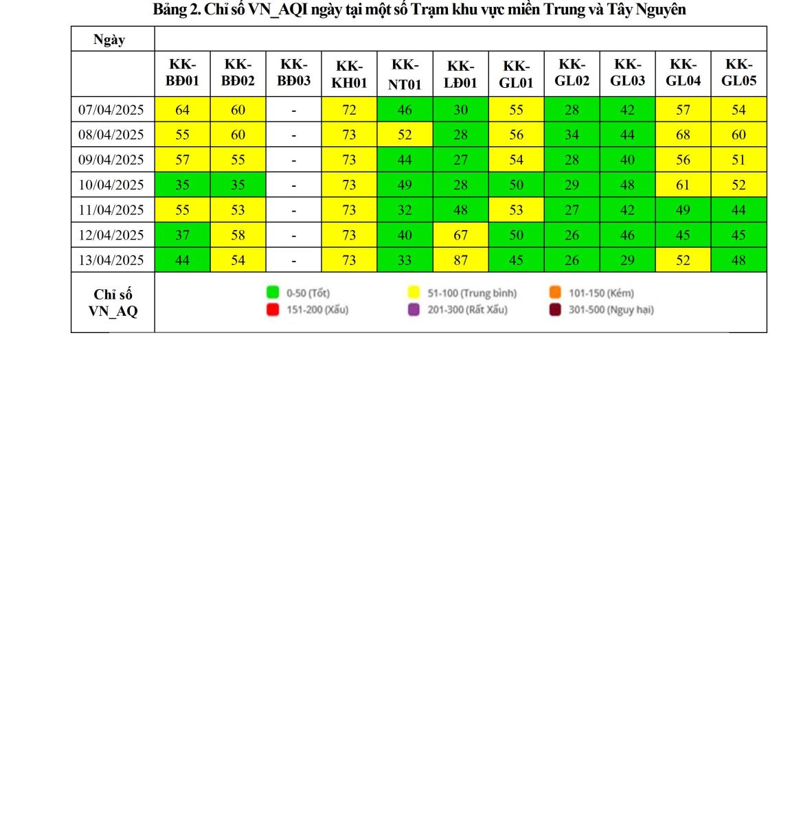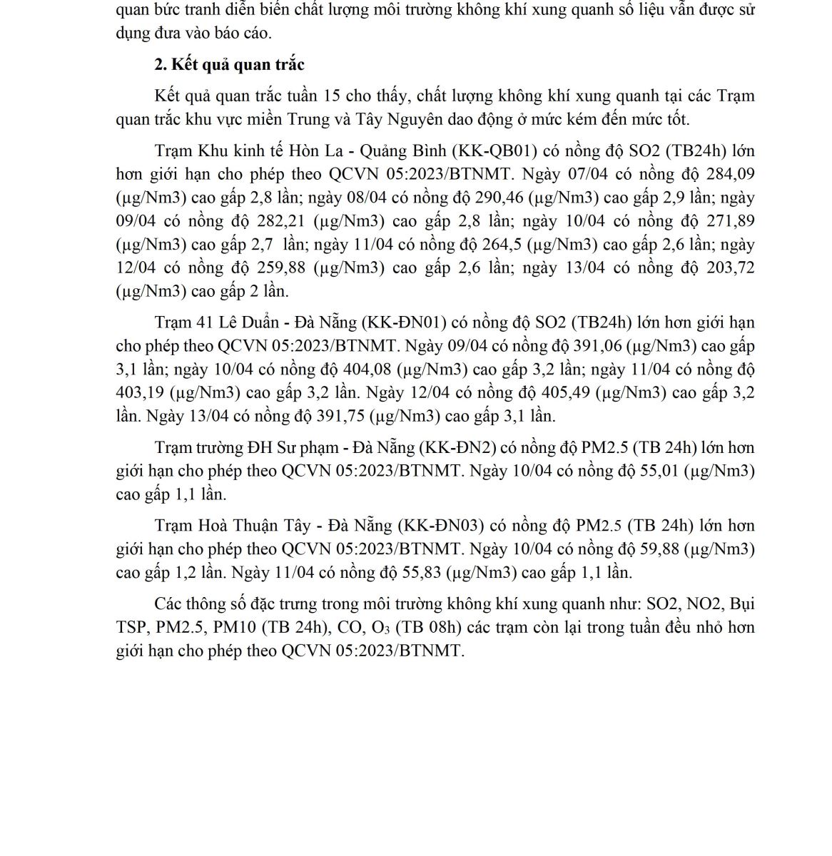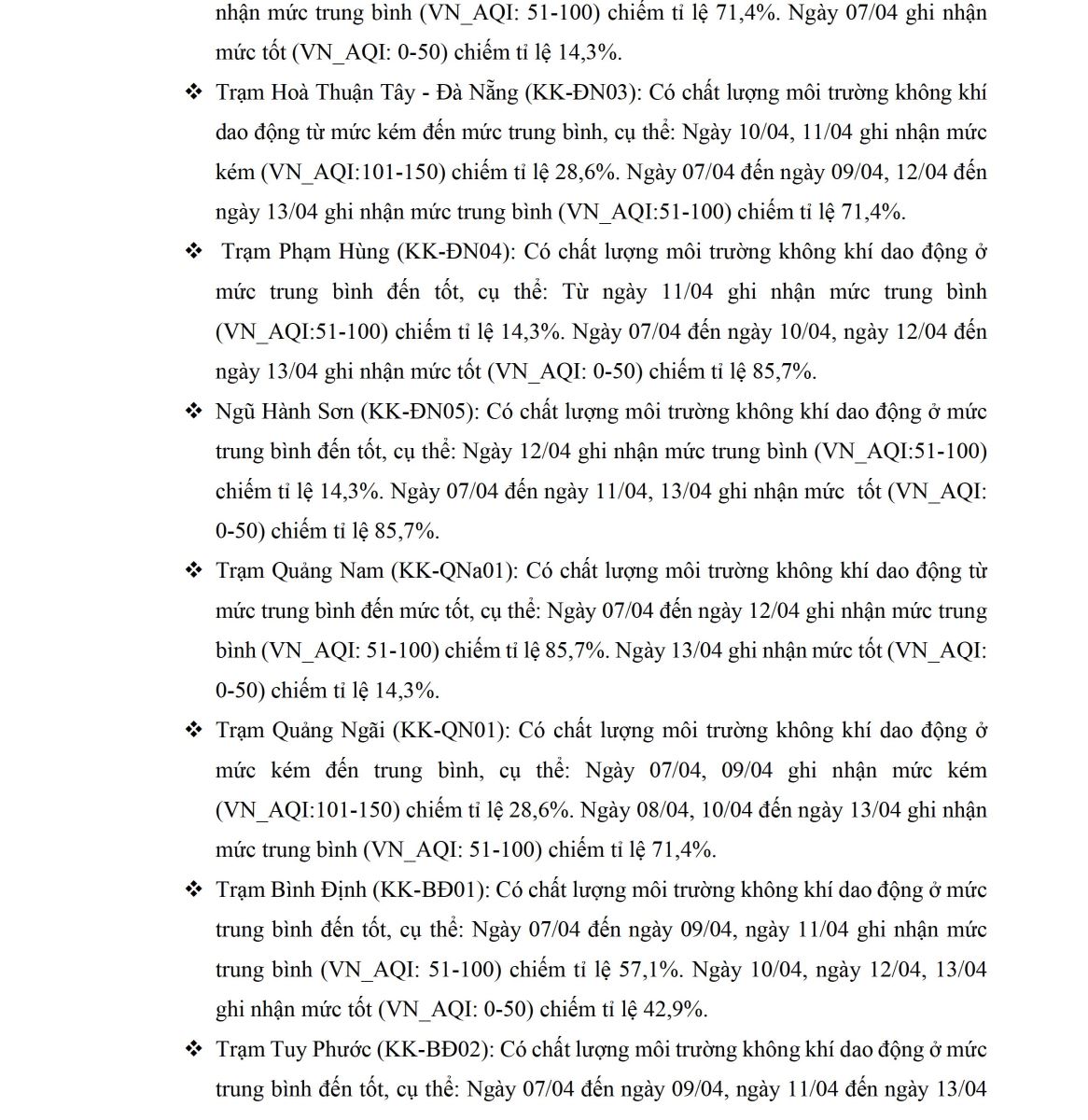 BÁO CÁO DIỄN BIẾN CHẤT LƯỢNG MÔI TRƯỜNG KHÔNG KHÍ XUNG QUANH TẠI KHU VỰC MIỀN TRUNG VÀ TÂY NGUYÊN Tuần 15 (từ ngày 07/04/2025 đến ngày 13/04/2025)