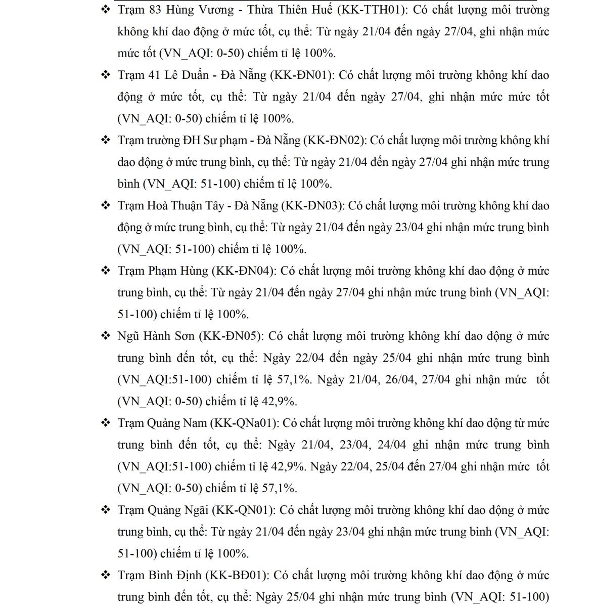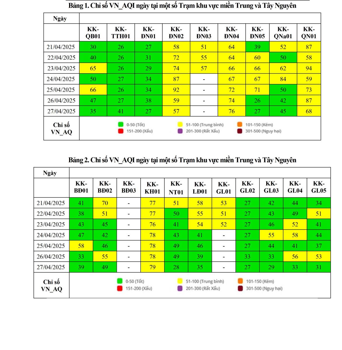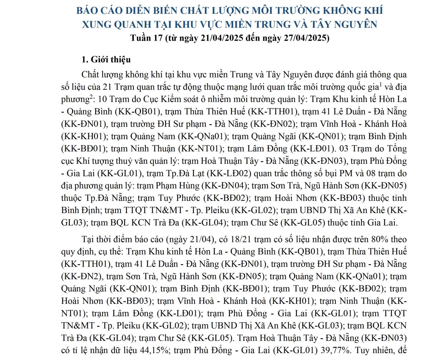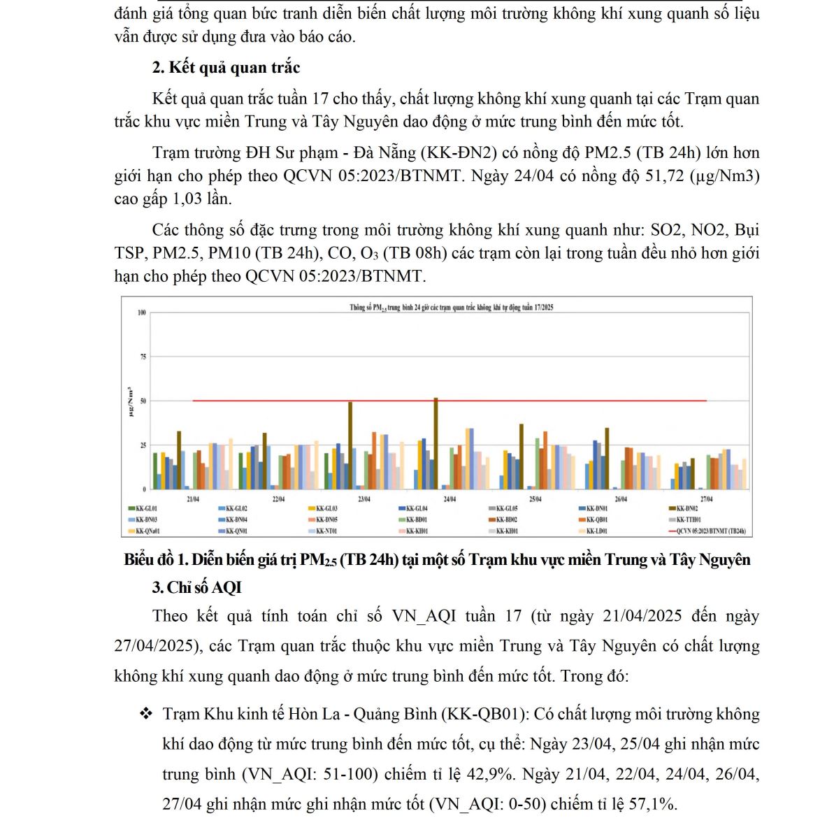 BÁO CÁO DIỄN BIẾN CHẤT LƯỢNG MÔI TRƯỜNG KHÔNG KHÍ XUNG QUANH TẠI KHU VỰC MIỀN TRUNG VÀ TÂY NGUYÊN Tuần 17 (từ ngày 21/04/2025 đến ngày 27/04/2025)