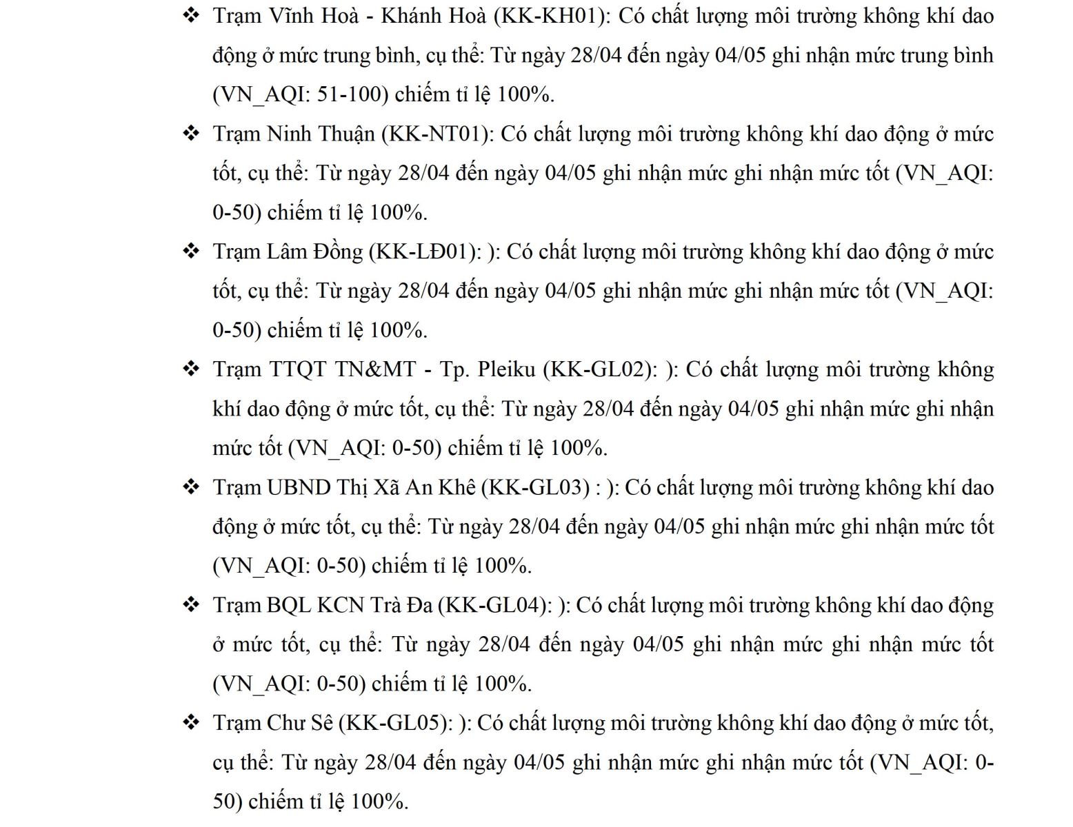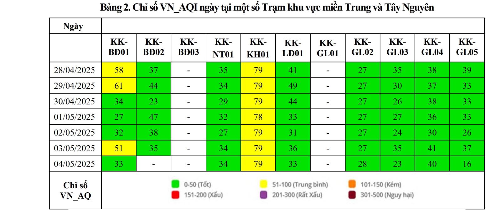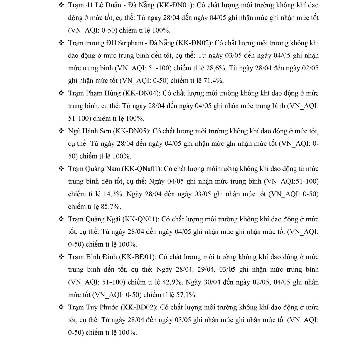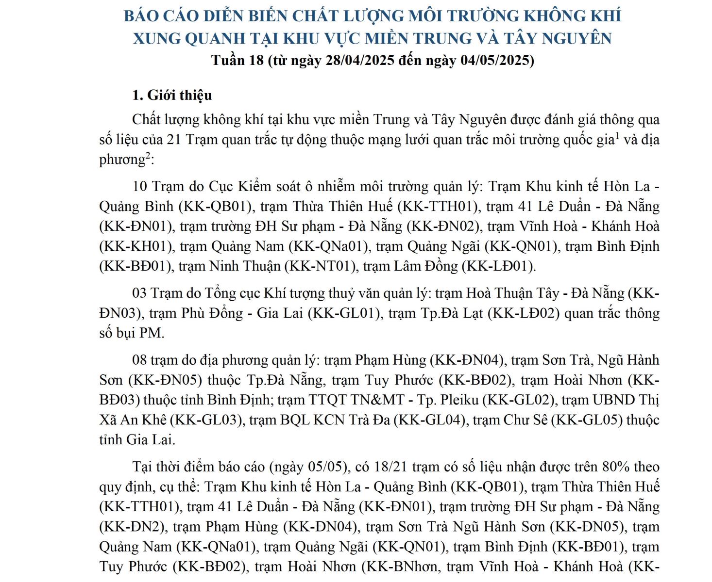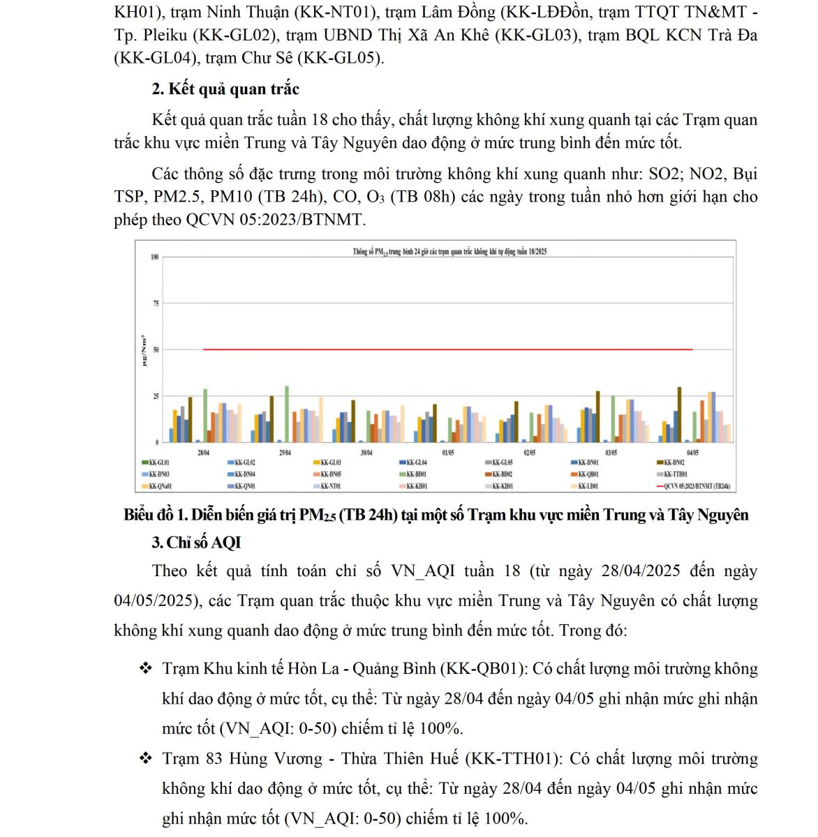 BÁO CÁO DIỄN BIẾN CHẤT LƯỢNG MÔI TRƯỜNG KHÔNG KHÍ XUNG QUANH TẠI KHU VỰC MIỀN TRUNG VÀ TÂY NGUYÊN Tuần 18 (từ ngày 28/04/2025 đến ngày 04/05/2025)