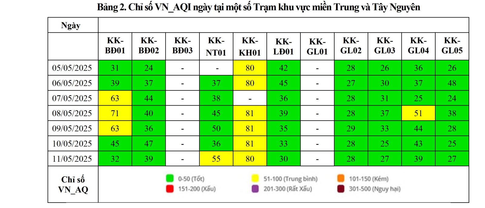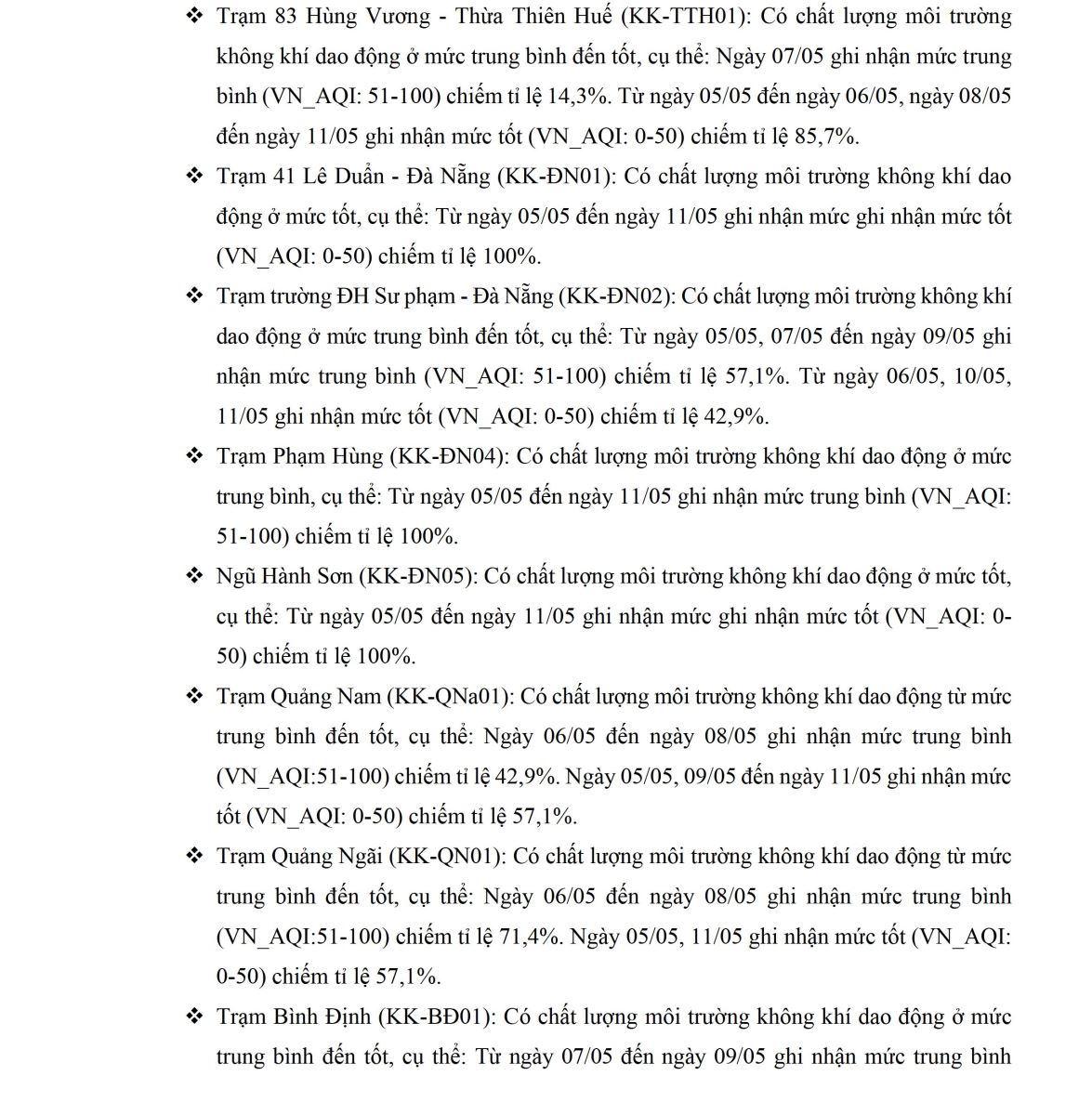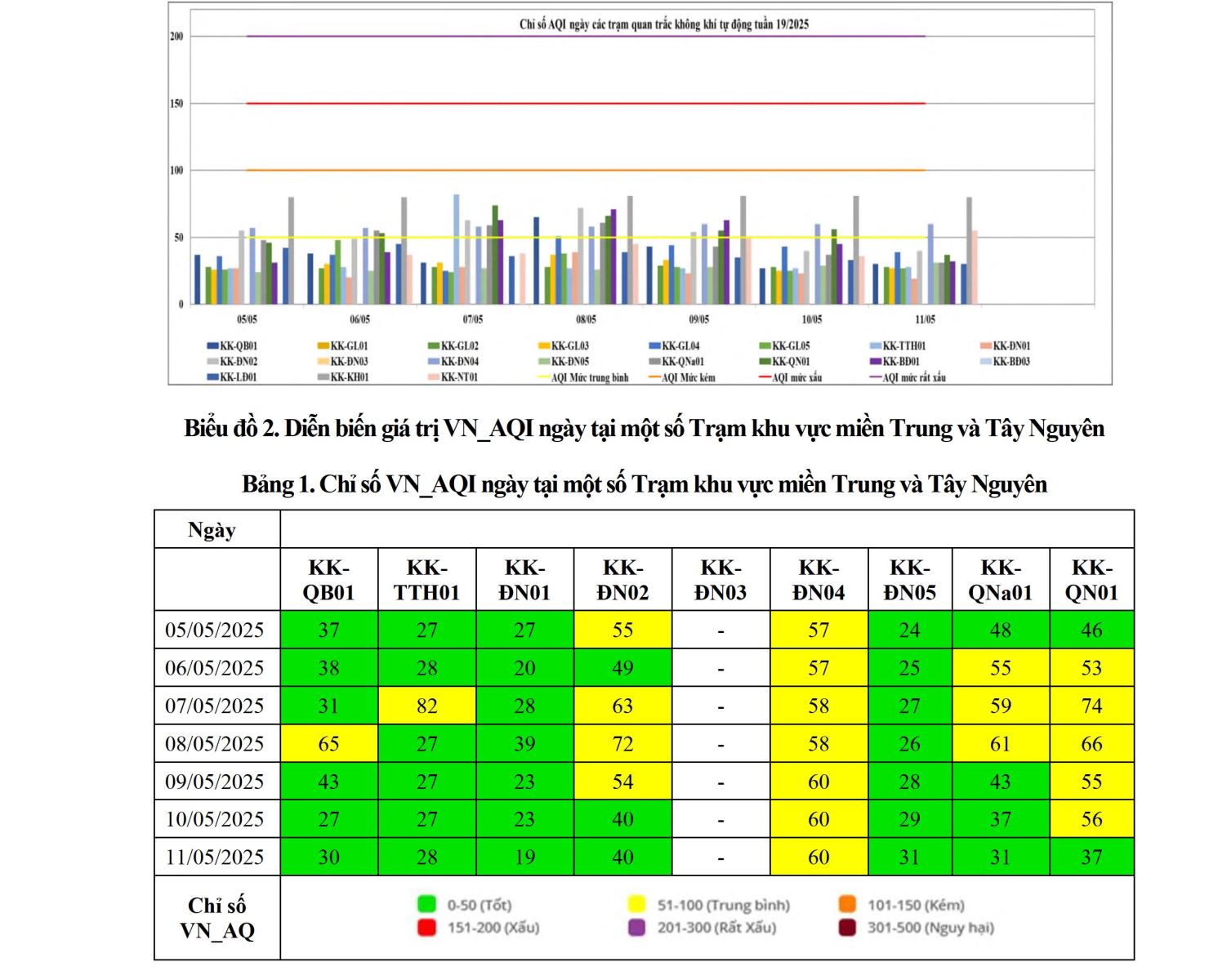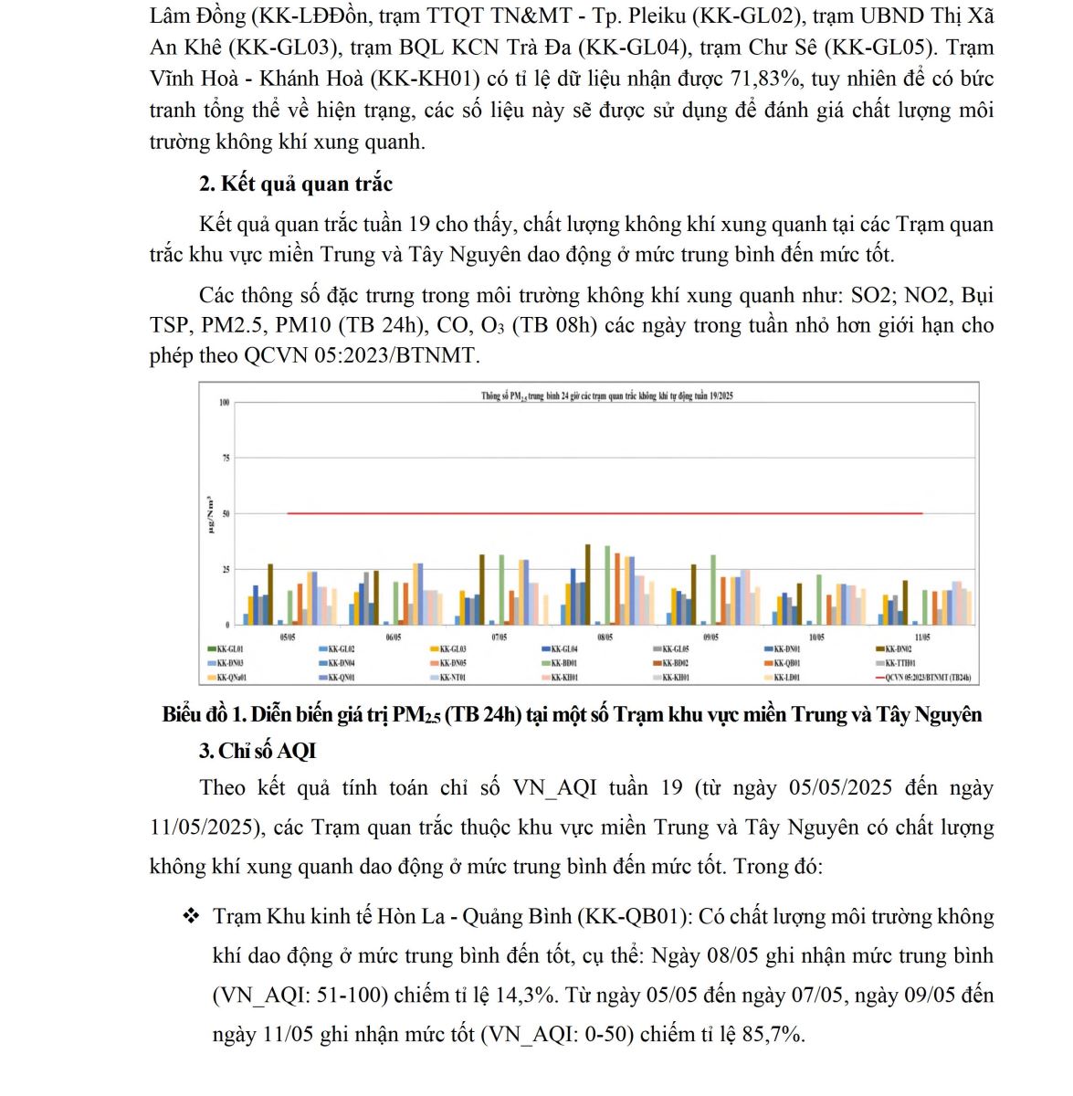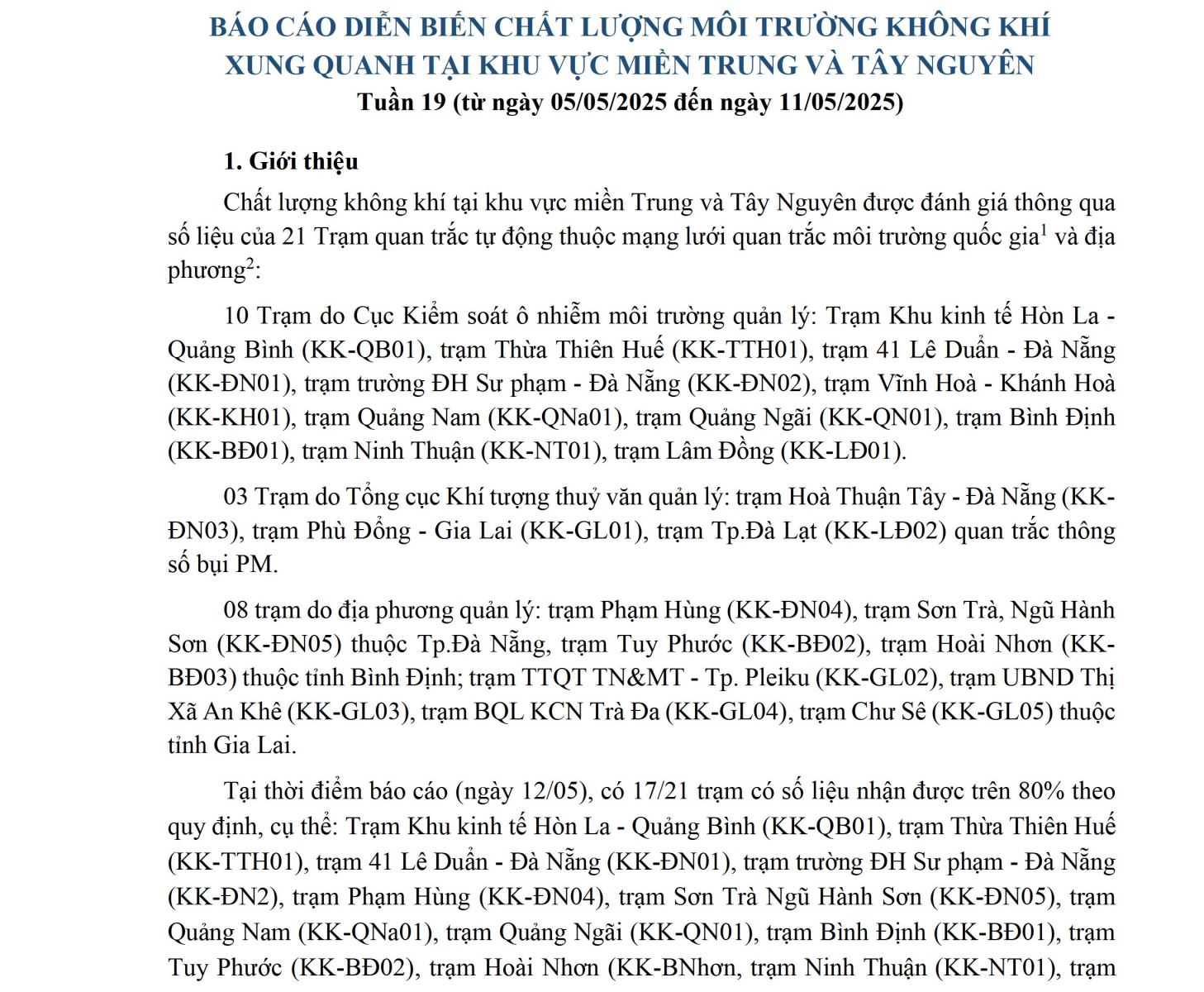 BÁO CÁO DIỄN BIẾN CHẤT LƯỢNG MÔI TRƯỜNG KHÔNG KHÍ XUNG QUANH TẠI KHU VỰC MIỀN TRUNG VÀ TÂY NGUYÊN Tuần 19 (từ ngày 05/05/2025 đến ngày 11/05/2025)