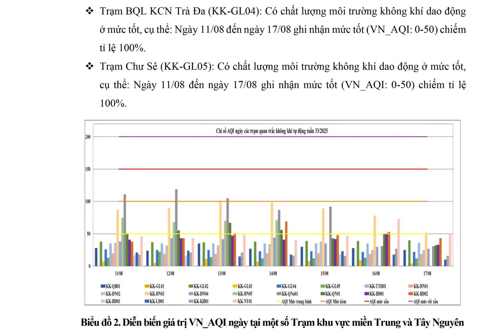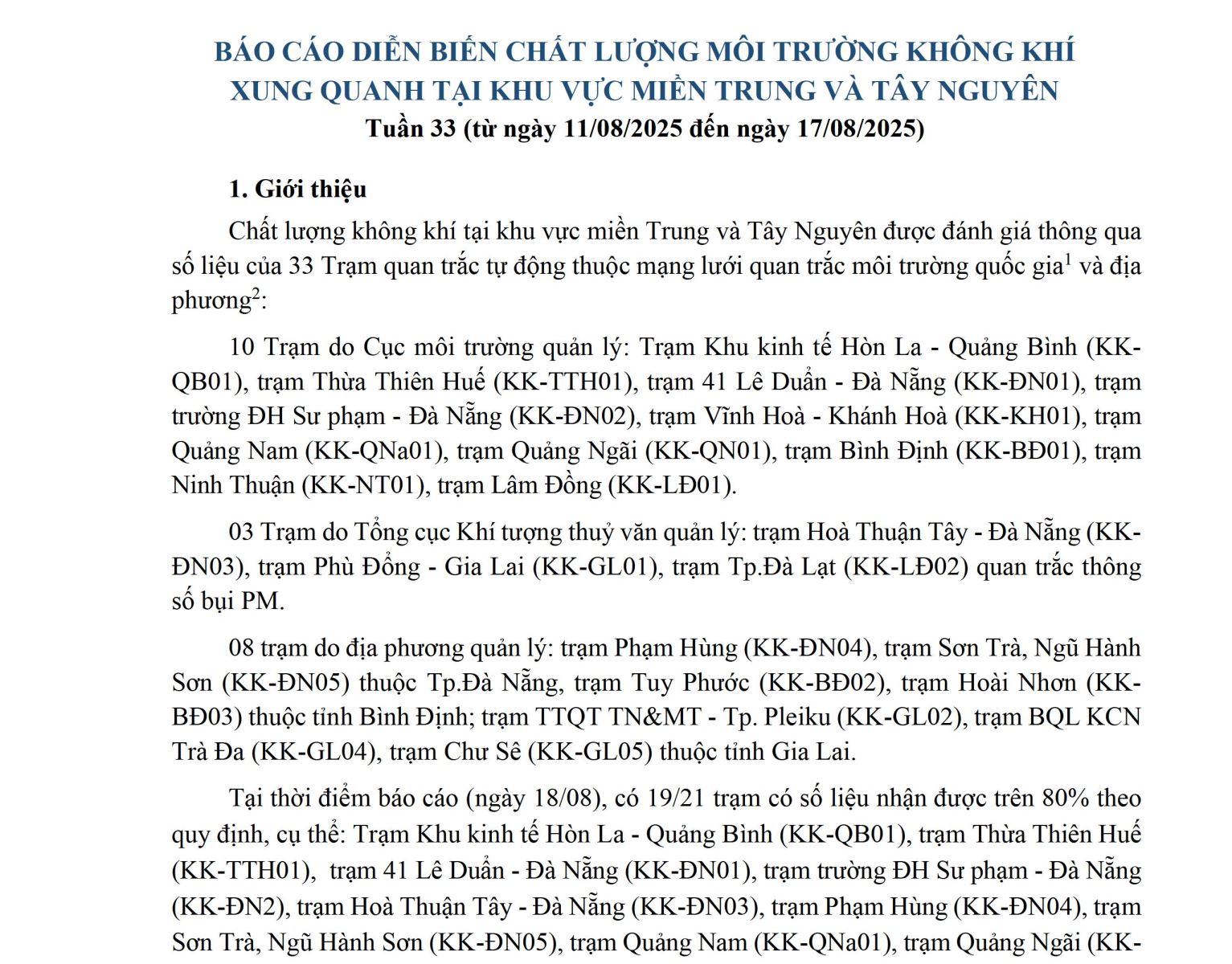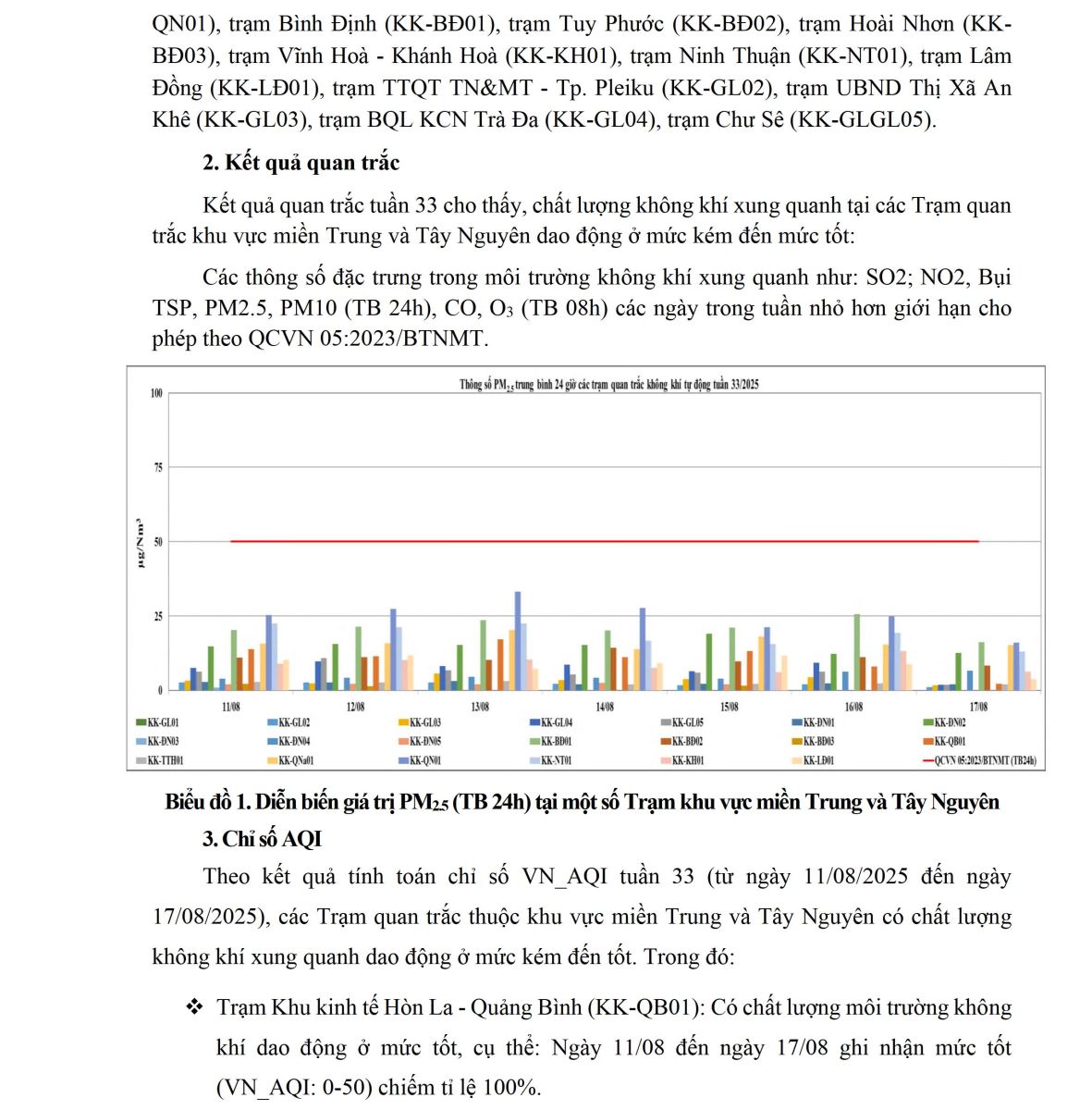 BÁO CÁO DIỄN BIẾN CHẤT LƯỢNG MÔI TRƯỜNG KHÔNG KHÍ XUNG QUANH TẠI KHU VỰC MIỀN TRUNG VÀ TÂY NGUYÊN Tuần 33 (từ ngày 11/08/2025 đến ngày 17/08/2025)