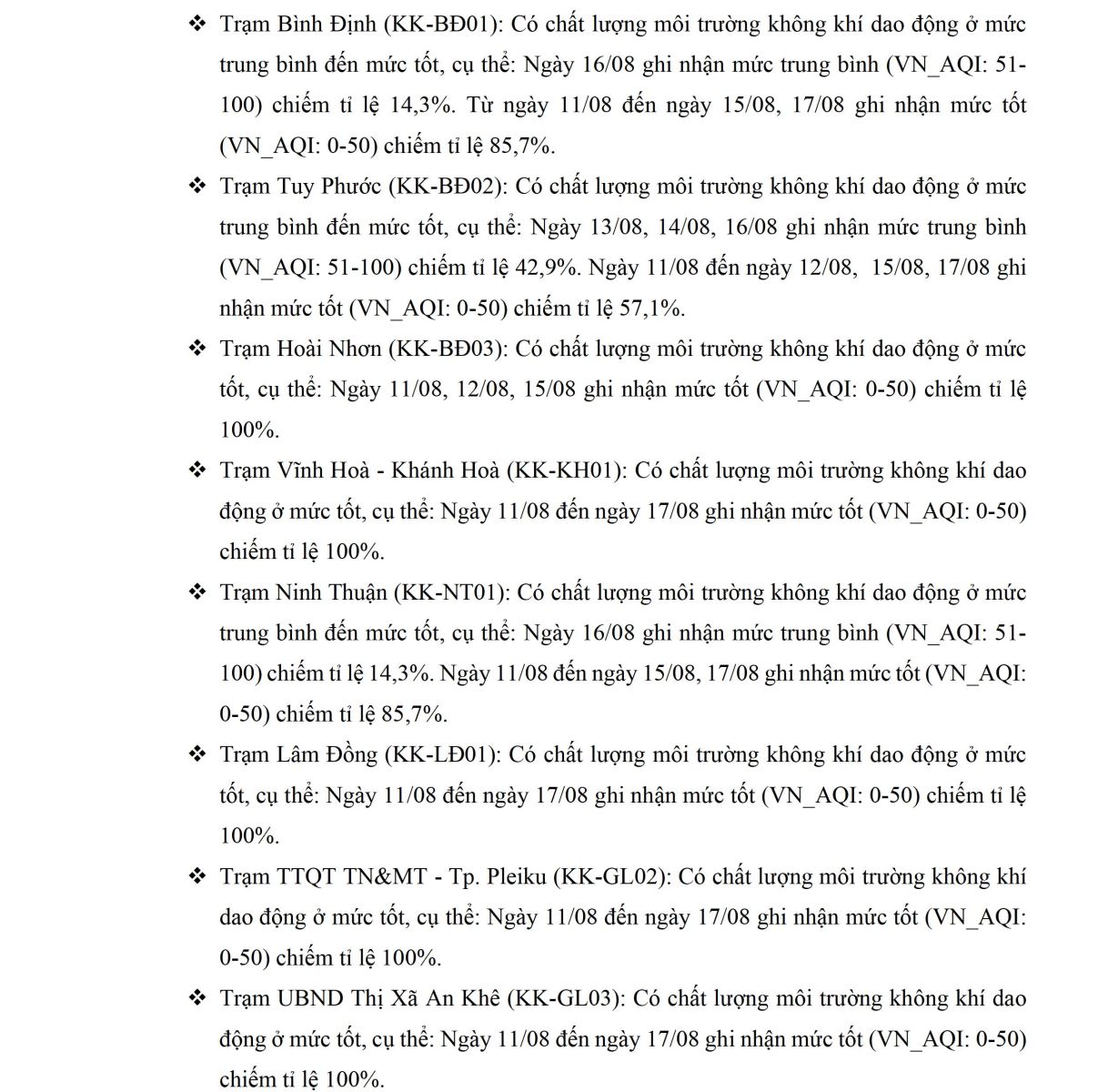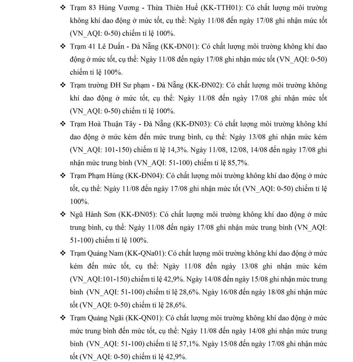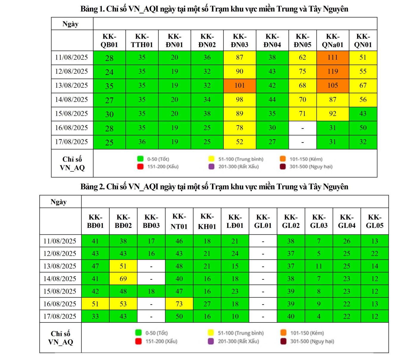 BÁO CÁO DIỄN BIẾN CHẤT LƯỢNG MÔI TRƯỜNG KHÔNG KHÍ XUNG QUANH TẠI KHU VỰC MIỀN TRUNG VÀ TÂY NGUYÊN Tuần 33 (từ ngày 11/08/2025 đến ngày 17/08/2025)