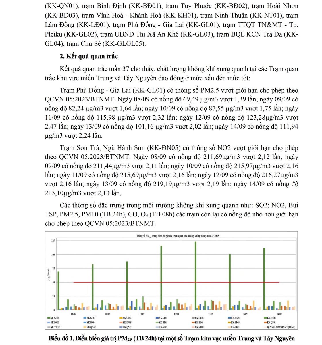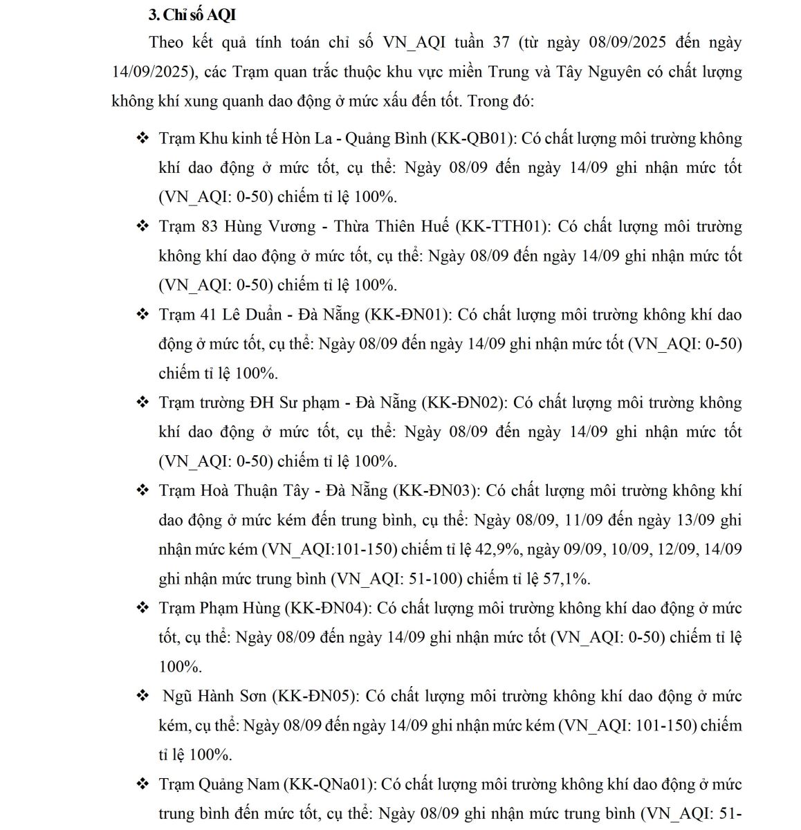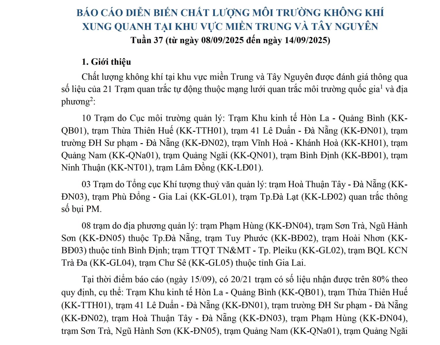 BÁO CÁO DIỄN BIẾN CHẤT LƯỢNG MÔI TRƯỜNG KHÔNG KHÍ XUNG QUANH TẠI KHU VỰC MIỀN TRUNG VÀ TÂY NGUYÊN Tuần 37 (từ ngày 08/09/2025 đến ngày 14/09/2025)