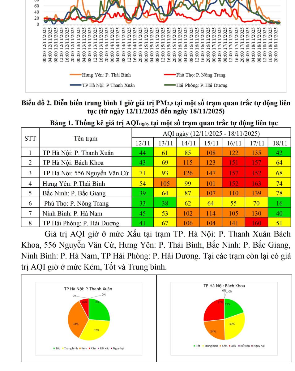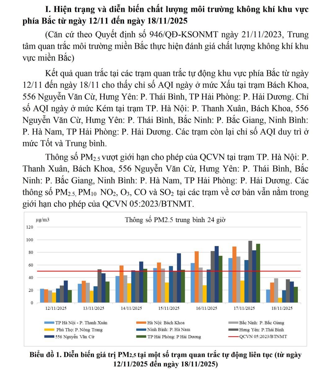 Hiện trạng và diễn biến chất lượng môi trường không khí khu vực phía Bắc từ ngày 12/11 đến ngày 18/11/2025