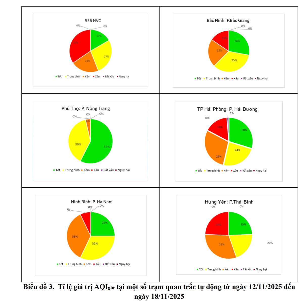 Kết quả quan trắc tại các trạm quan trắc tự động khu vực phía Bắc từ ngày 12/11 đến ngày 18/11 cho thấy chỉ số AQI ngày ở mức Xấu tại trạm Bách Khoa, 556 Nguyễn Văn Cừ, Hưng Yên: P. Thái Bình, TP Hải Phòng: P. Hải Dương. Chỉ số AQI ngày ở mức Kém tại trạm TP. Hà Nội: P. Thanh Xuân, Bách Khoa, 556 Nguyễn Văn Cừ, Hưng Yên: P. Thái Bình, Bắc Ninh: P. Bắc Giang, Ninh Bình: P. Hà Nam, TP Hải Phòng: P. Hải Dương. Các trạm còn lại chỉ số AQI duy trì ở mức Tốt và Trung bình.
