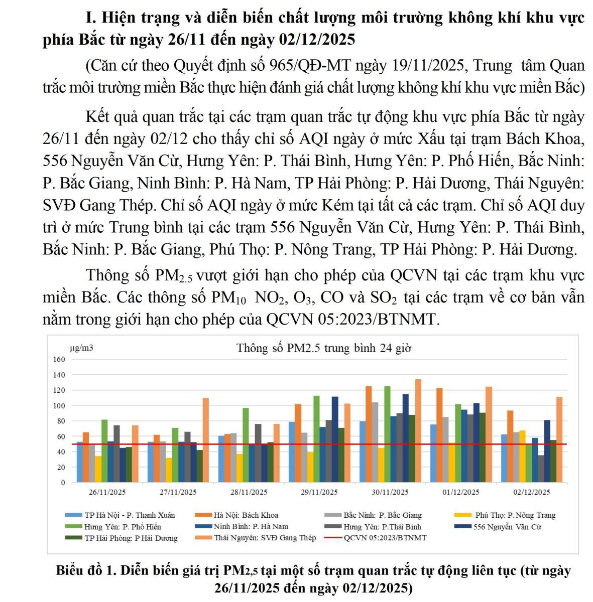 Hiện trạng và diễn biến chất lượng môi trường không khí khu vực phía Bắc từ ngày 26/11 đến ngày 02/12/2025