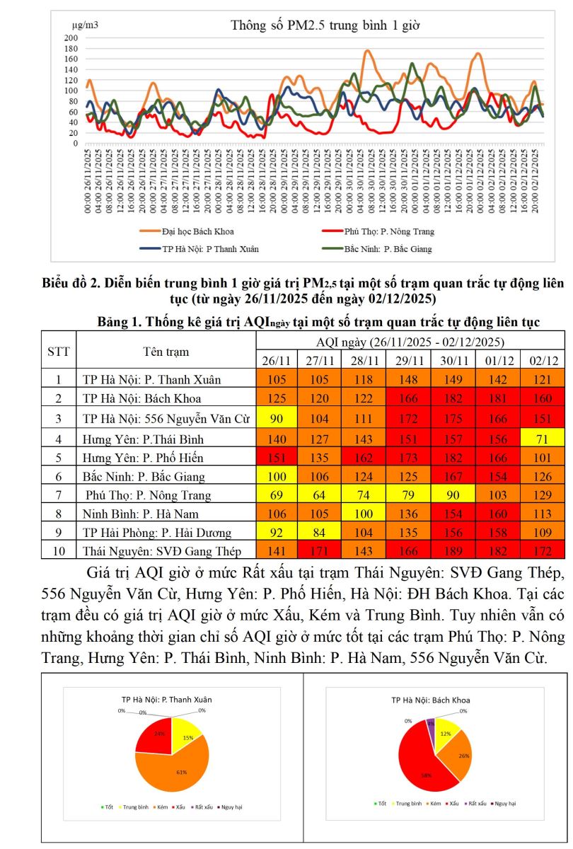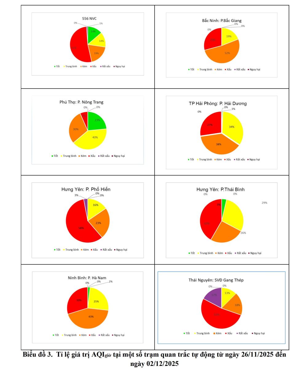 Kết quả quan trắc tại các trạm quan trắc tự động khu vực phía Bắc từ ngày 26/11 đến ngày 02/12 cho thấy chỉ số AQI ngày ở mức Xấu tại trạm Bách Khoa, 556 Nguyễn Văn Cừ, Hưng Yên: P. Thái Bình, Hưng Yên: P. Phố Hiến, Bắc Ninh: P. Bắc Giang, Ninh Bình: P. Hà Nam, TP Hải Phòng: P. Hải Dương, Thái Nguyên: SVĐ Gang Thép. Chỉ số AQI ngày ở mức Kém tại tất cả các trạm. Chỉ số AQI duy trì ở mức Trung bình tại các trạm 556 Nguyễn Văn Cừ, Hưng Yên: P. Thái Bình, Bắc Ninh: P. Bắc Giang, Phú Thọ: P. Nông Trang, TP Hải Phòng: P. Hải Dương.