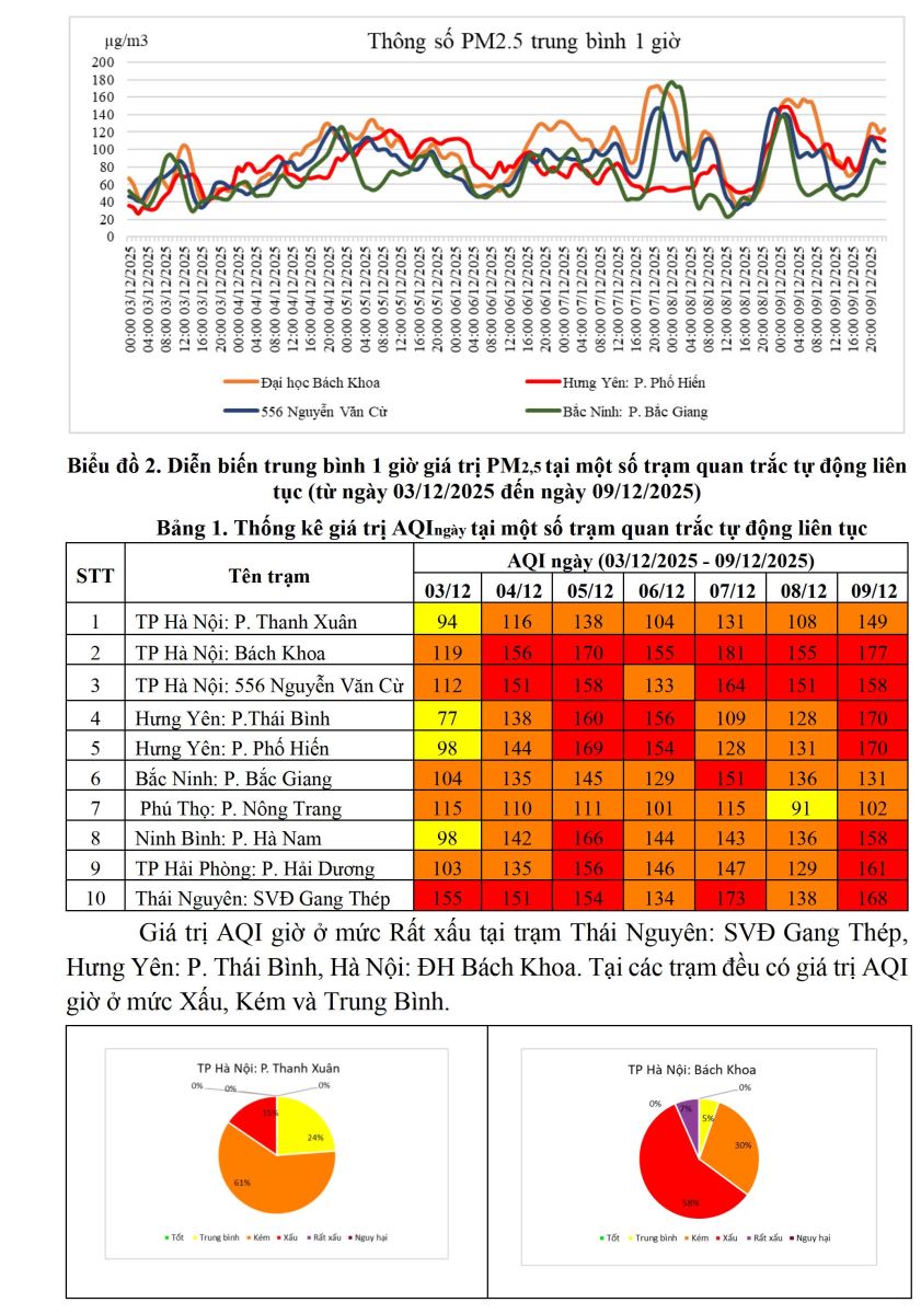 Kết quả quan trắc tại các trạm quan trắc tự động khu vực phía Bắc từ ngày 03/12 đến ngày 09/12 cho thấy chỉ số AQI ngày ở mức Xấu tại trạm Bách Khoa, 556 Nguyễn Văn Cừ, Hưng Yên: P. Thái Bình, Hưng Yên: P. Phố Hiến, Bắc Ninh: P. Bắc Giang, Ninh Bình: P. Hà Nam, TP Hải Phòng: P. Hải Dương, Thái Nguyên: SVĐ Gang Thép. Chỉ số AQI ngày ở mức Kém tại các trạm còn lại. Chỉ số AQI duy trì ở mức Trung bình tại các trạm TP. Hà Nội, 556 Nguyễn Văn Cừ, Hưng Yên: P. Thái Bình, Hưng Yên: P. Phố Hiến, Phú Thọ: P. Nông Trang, Ninh Bình: P. Hà Nam.