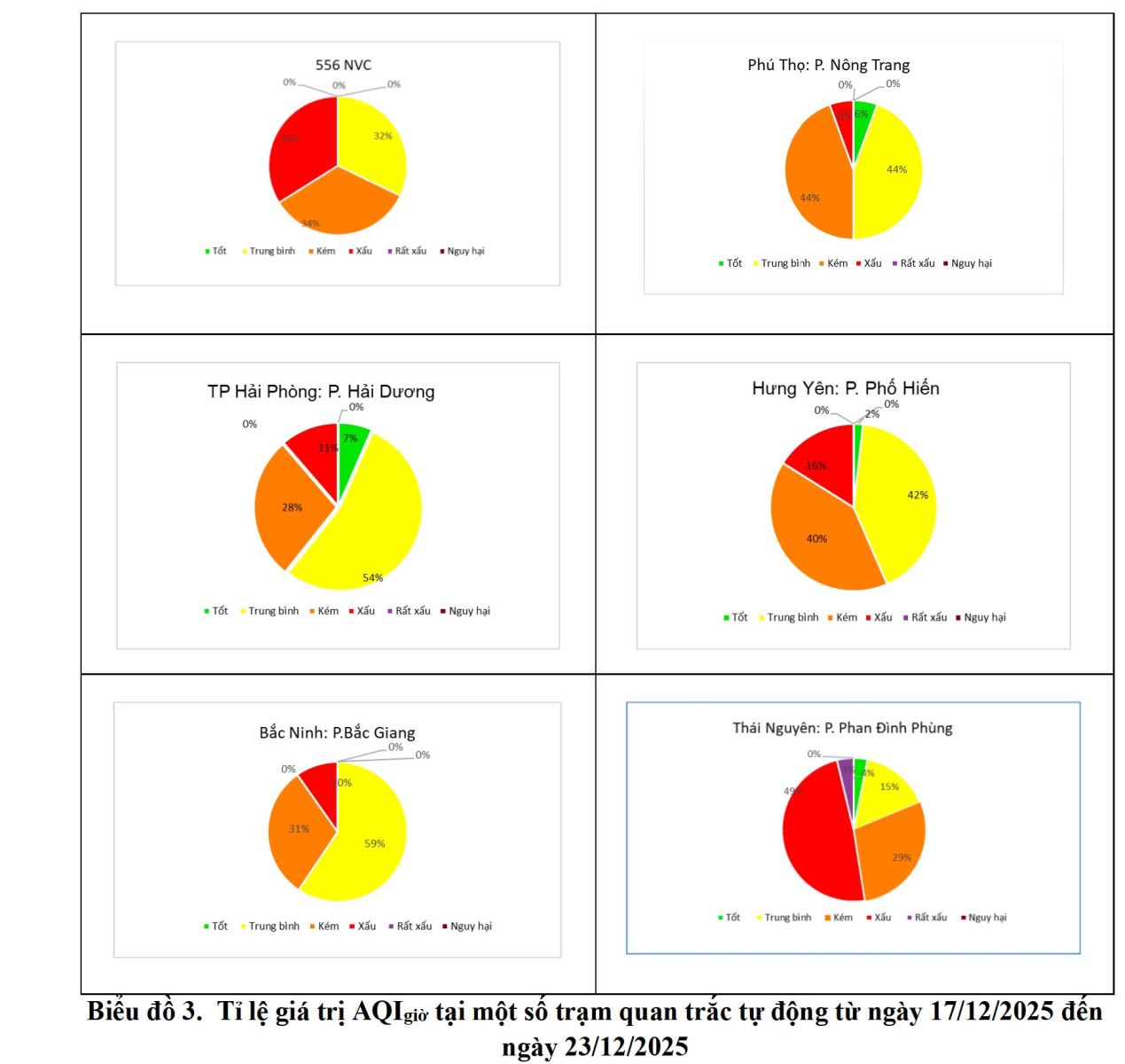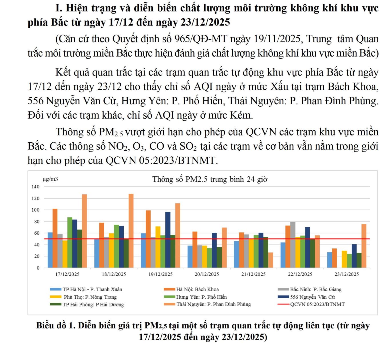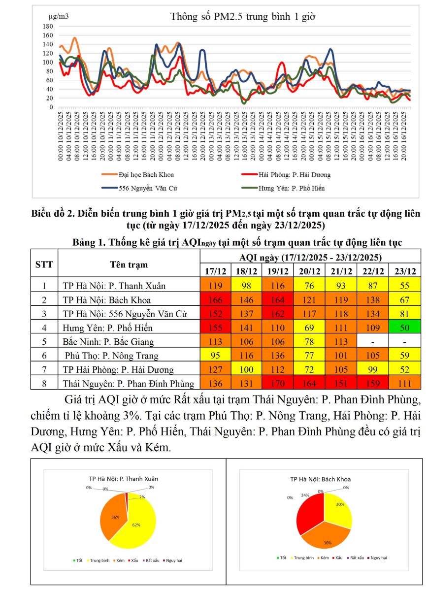 Kết quả quan trắc tại các trạm quan trắc tự động khu vực phía Bắc từ ngày 17/12 đến ngày 23/12 cho thấy chỉ số AQI ngày ở mức Xấu tại trạm Bách Khoa, 556 Nguyễn Văn Cừ, Hưng Yên: P. Phố Hiến, Thái Nguyên: P. Phan Đình Phùng.