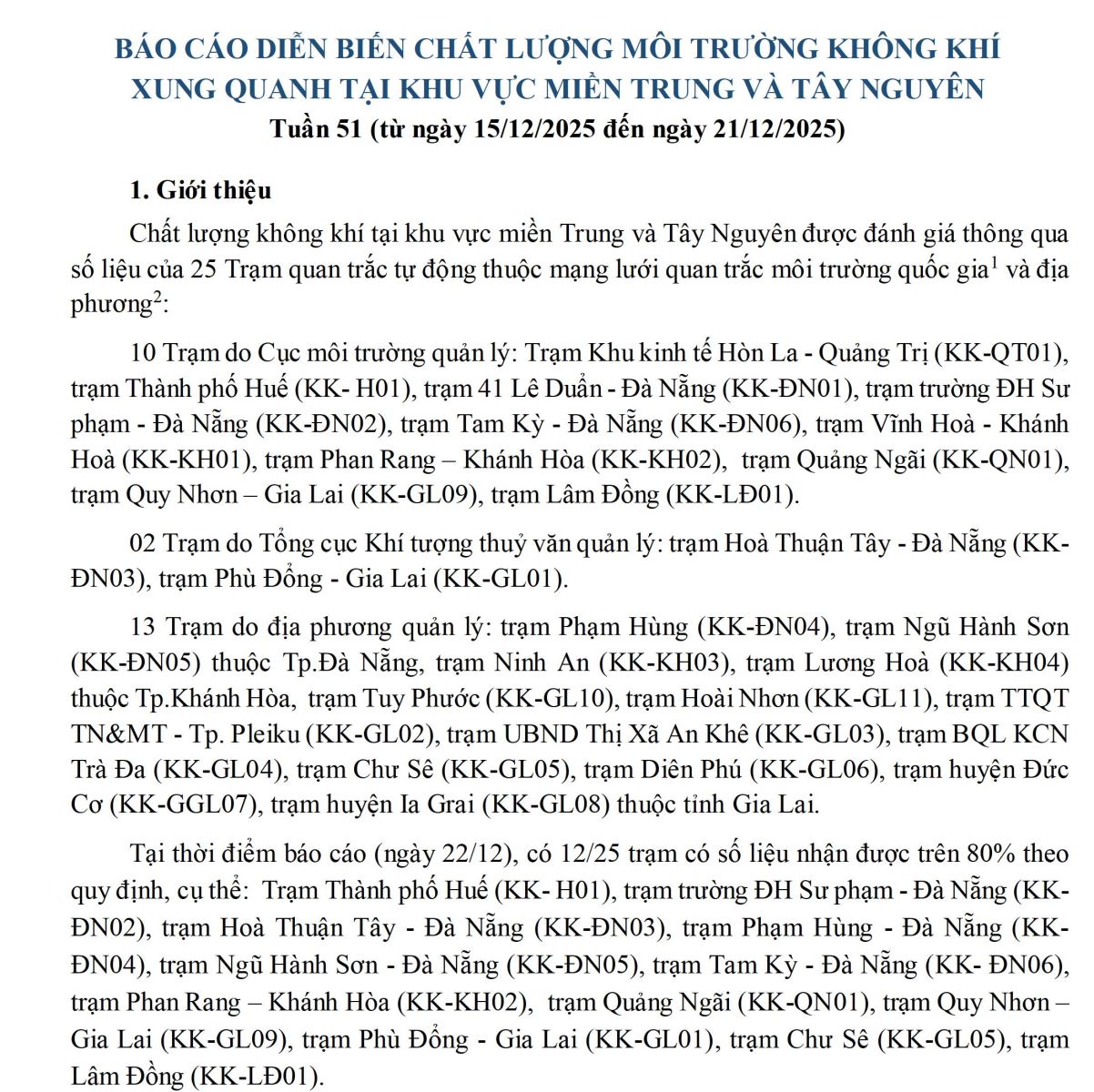 - CHẤT LƯỢNG MÔI TRƯỜNG KHÔNG KHÍ XUNG QUANH TẠI KHU VỰC MIỀN TRUNG VÀ TÂY NGUYÊN Tuần 52 (từ ngày 22/12/2025 đến ngày 28/12/2025)