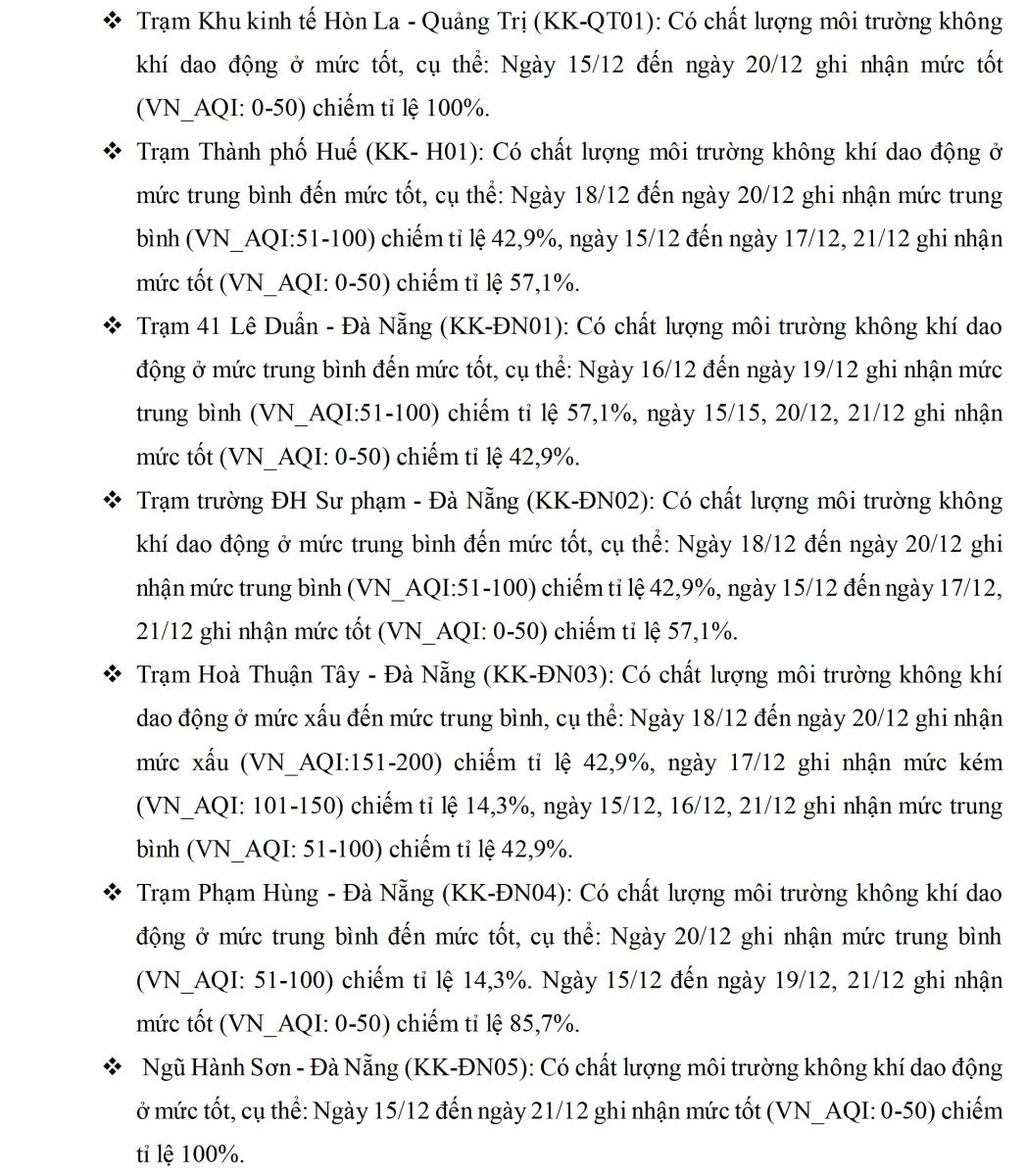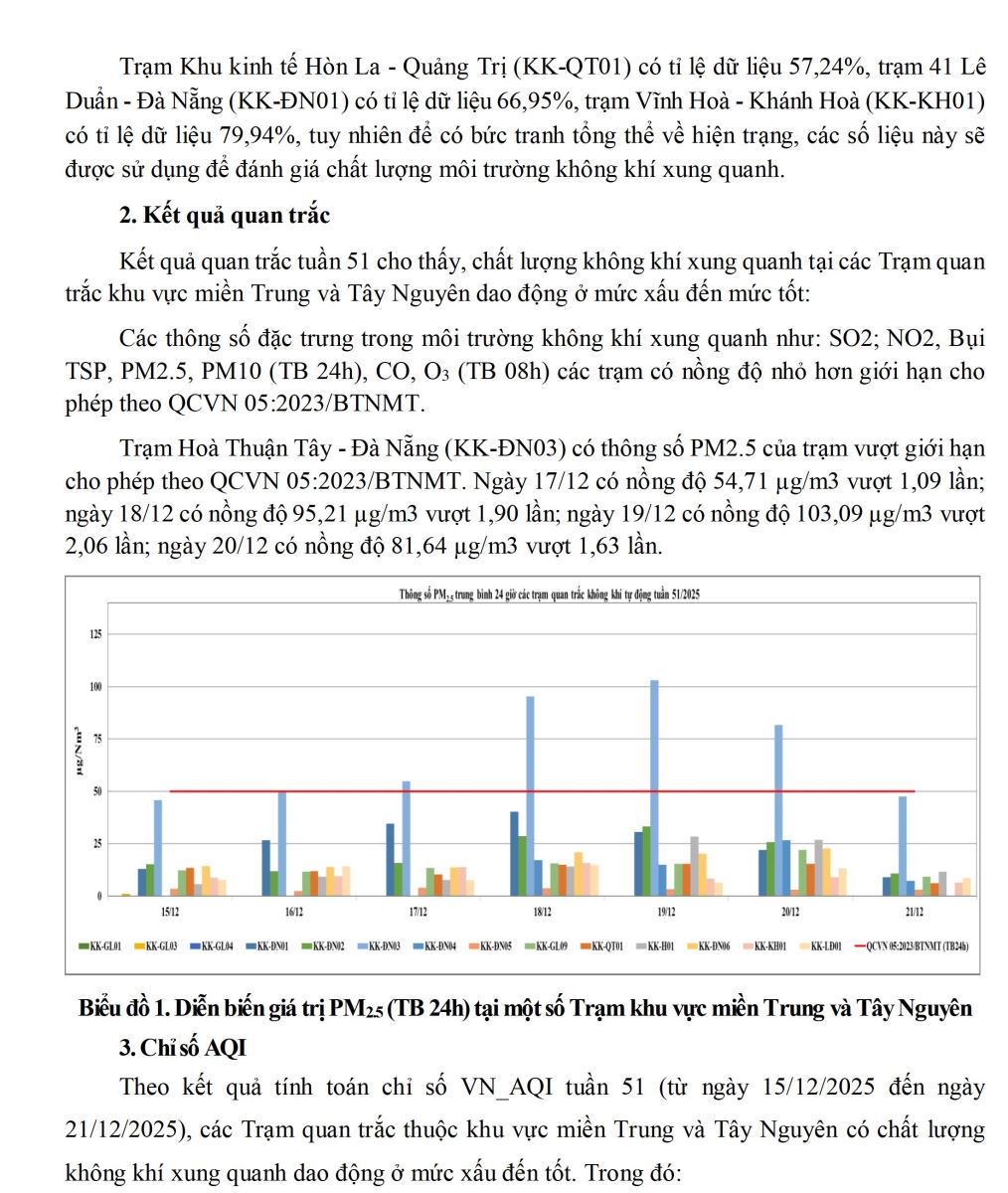 CHẤT LƯỢNG MÔI TRƯỜNG KHÔNG KHÍ XUNG QUANH TẠI KHU VỰC MIỀN TRUNG VÀ TÂY NGUYÊN Tuần 51 (từ ngày 15/12/2025 đến ngày 21/12/2025)