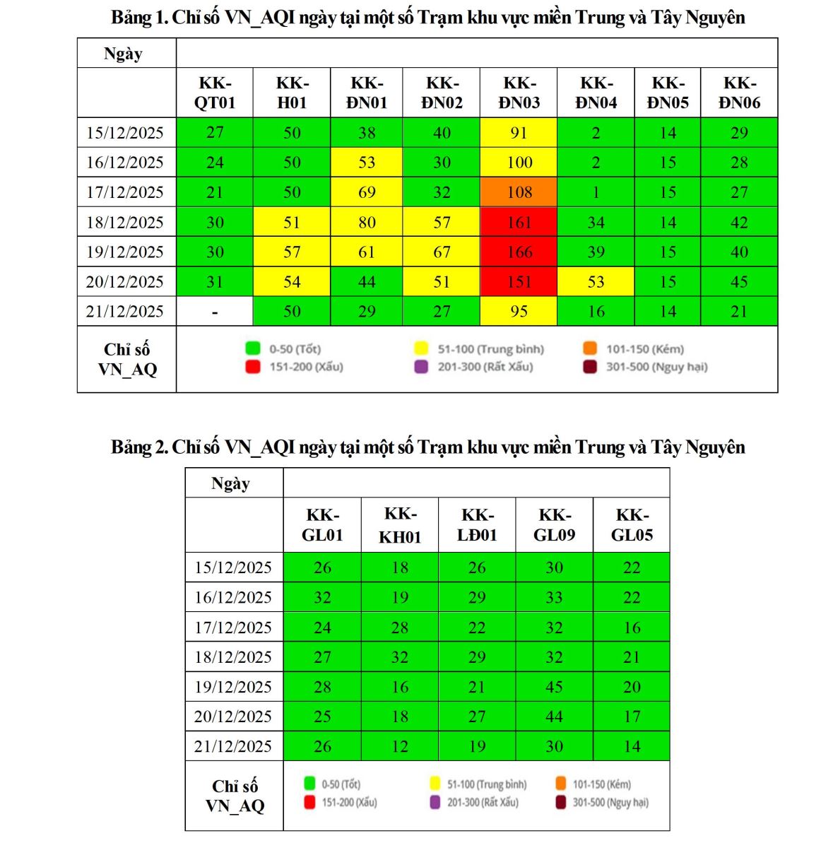 - CHẤT LƯỢNG MÔI TRƯỜNG KHÔNG KHÍ XUNG QUANH TẠI KHU VỰC MIỀN TRUNG VÀ TÂY NGUYÊN Tuần 50 (từ ngày 08/12/2025 đến ngày 14/12/2025)