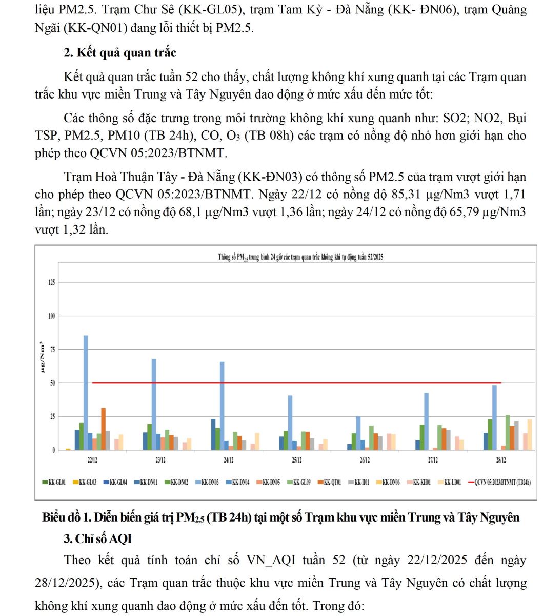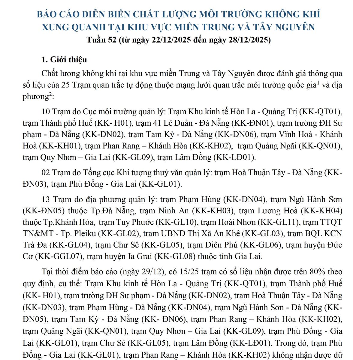 CHẤT LƯỢNG MÔI TRƯỜNG KHÔNG KHÍ XUNG QUANH TẠI KHU VỰC MIỀN TRUNG VÀ TÂY NGUYÊN Tuần 52 (từ ngày 22/12/2025 đến ngày 28/12/2025)