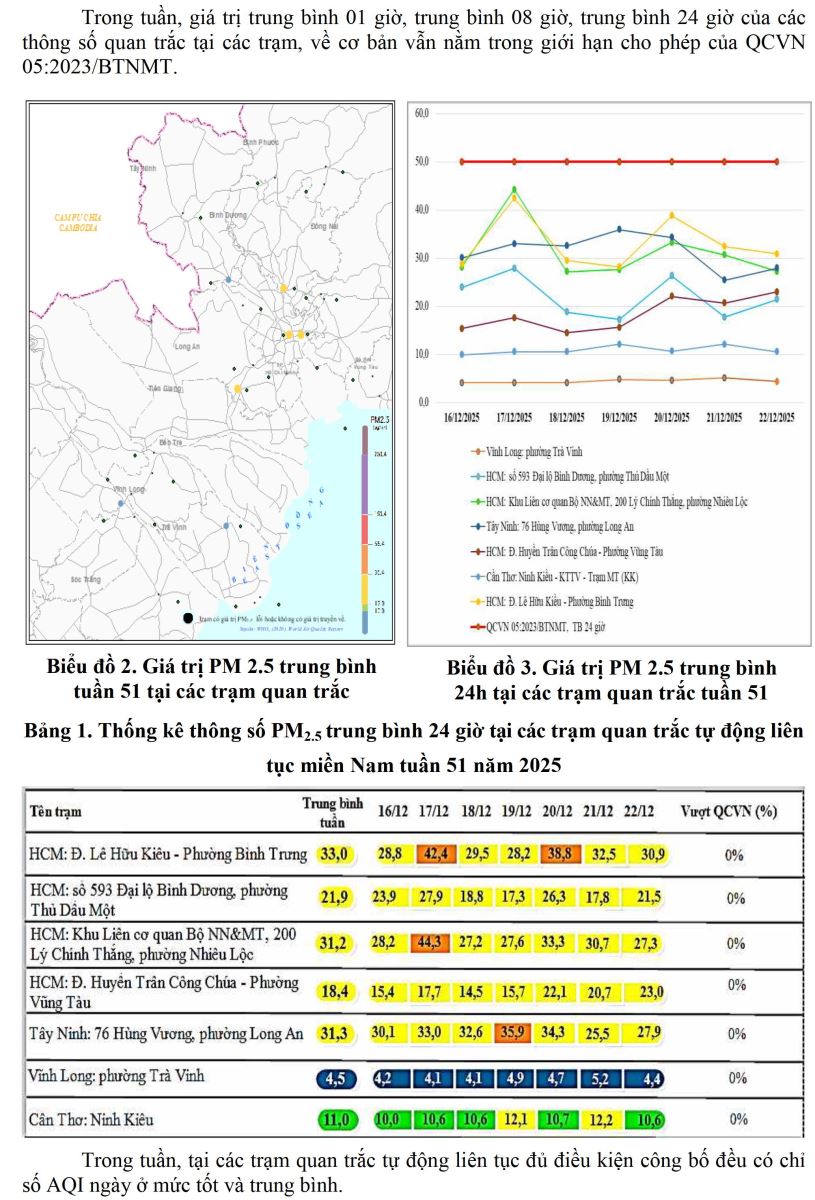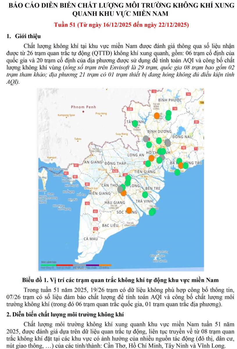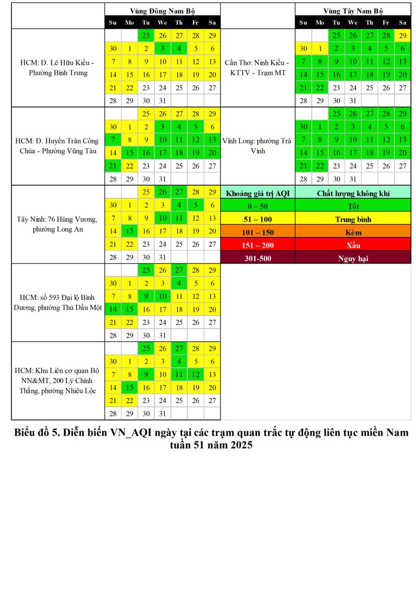 CHẤT LƯỢNG MÔI TRƯỜNG KHÔNG KHÍ XUNG QUANH KHU VỰC MIỀN NAM Tuần 51 (Từ ngày 16/12/2025 đến ngày 22/12/2025)