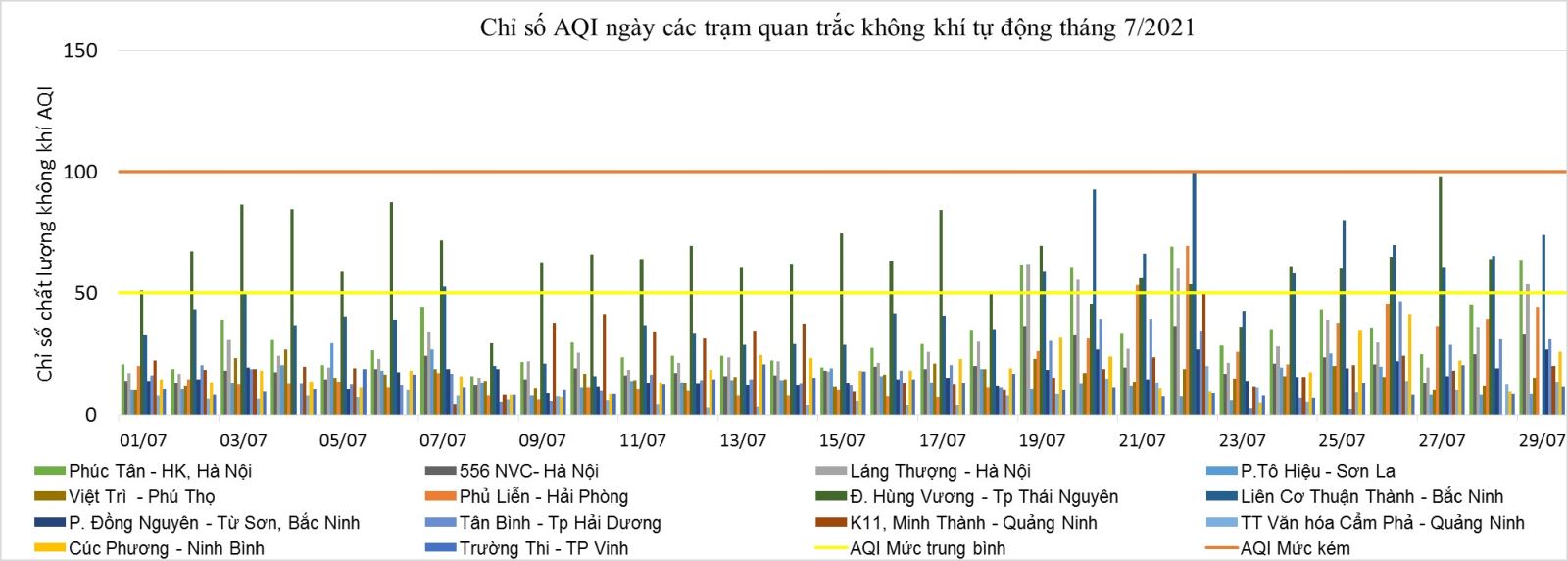 Giá trị AQI ngày ở mức trung bình được ghi nhận tại các Trạm trên địa bàn của Hà Nội, Bắc Ninh, Thái Nguyên, Hải Phòng và Quảng Ninh trong những ngày cuối tháng 7, cụ thể tại Trạm Láng Thượng và Trạm Phúc Tân – Hà Nội (04 ngày, gồm các ngày 19/7,20/7,22/7 và 29/7); Trạm Phủ Liễn – Hải Phòng (02 ngày, từ ngày 21 đến ngày 22/7); Trạm Liên Cơ Thuận Thành – Bắc Ninh (10 ngày, từ ngày 19 đến ngày 22/7 và từ ngày 24 đến ngày 29/7); Trạm Minh Thành- Hải Phòng (01 ngày, ngày 22/7). Riêng Trạm đường Hùng Vương – Thái Nguyên có 25/28 ngày thống kê trong tháng 7, giá trị AQI ngày ở mức trung bình.