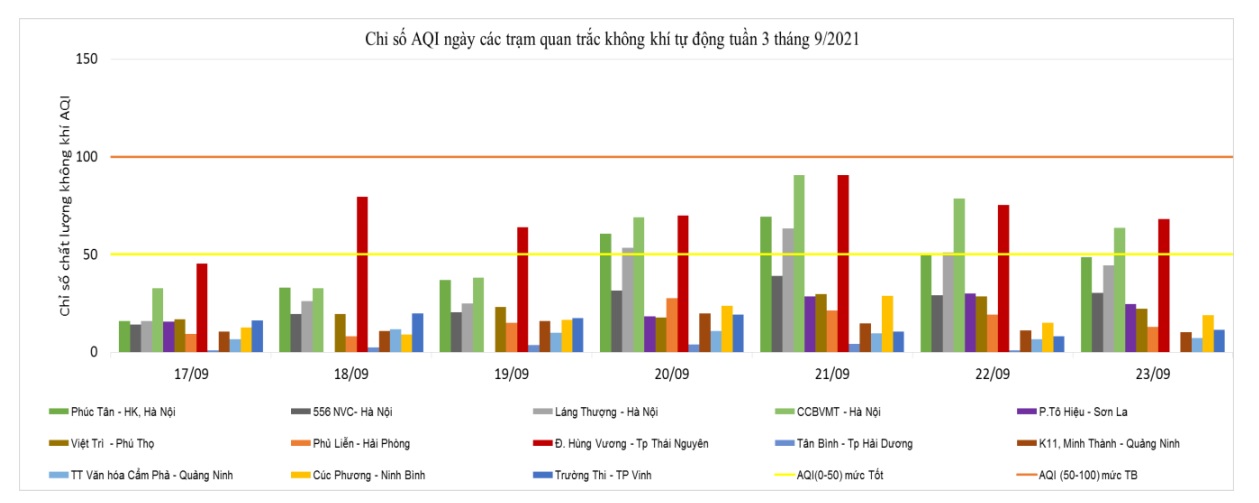 Theo kết quả tính toán Chỉ số chất lượng môi trường không khí AQI ngày tại các Trạm khu vực miền Bắc, phần lớn giá trị AQI ngày tại các Trạm duy trì ở mức tốt, giá trị AQI <50, một số ngày trong tuần ghi nhận chất lượng môi trường không khí ở mức trung bình, cụ thể: 03 Trạm tại Hà Nội: Trạm Chi cục Bảo vệ môi trường trong 4 ngày (ngày 20/9 đến ngày 23/9); Trạm Láng Thượng trong 3 ngày (ngày 20/9, 21/9, 22/9); Trạm Phúc Tân 2 ngày (20/9, 21/9); 01 Trạm tại Thái Nguyên: Trạm đường Hùng Vương trong 6 ngày liên tục (ngày 18/9, đến ngày 23/9), giá trị AQI ngày trong khoảng 51-91.