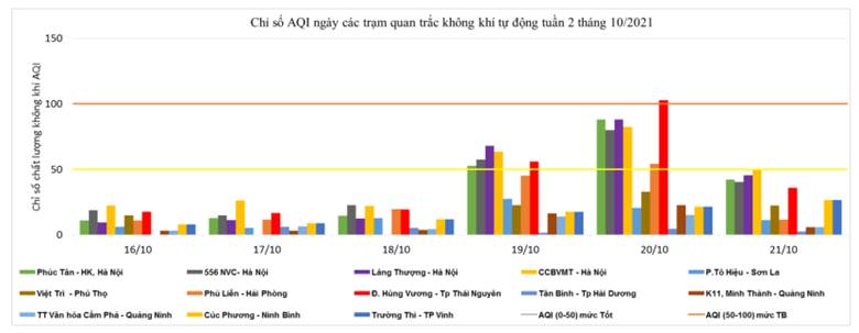 Theo kết quả tính toán Chỉ số chất lượng môi trường không khí AQI ngày trong tuần tại các Trạm khu vực miền Bắc cho thấy phần lớn giá trị AQI ngày tại các Trạm duy trì ở mức tốt, giá trị AQI <50, tuy nhiên trong 02 ngày 19/10 và 20/10 đã ghi nhận chất lượng môi trường không khí ở mức trung bình tại: 04 Trạm Hà Nội: Trạm Láng Thượng, Trạm Phúc Tân, Trạm 556 Nguyễn Văn Cừ, Trạm Chi cục Bảo vệ môi trường và Trạm Phú Liễn – Hải Phòng, giá trị AQI ngày trong khoảng 53 - 88.
