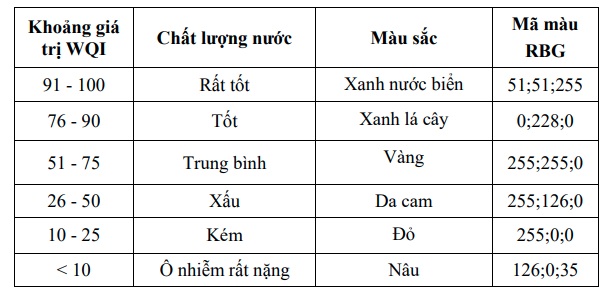 VN WQI là một chỉ số tổ hợp được tính toán từ các thông số chất lượng nước, xác định thông qua một công thức toán học. WQI dùng để mô tả định lượng về chất lượng nước và được biểu diễn qua một thang điểm. VN WQI được đánh giá và công bố thông qua thang điểm: