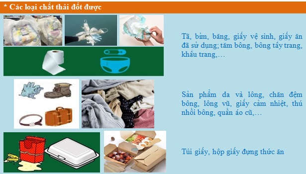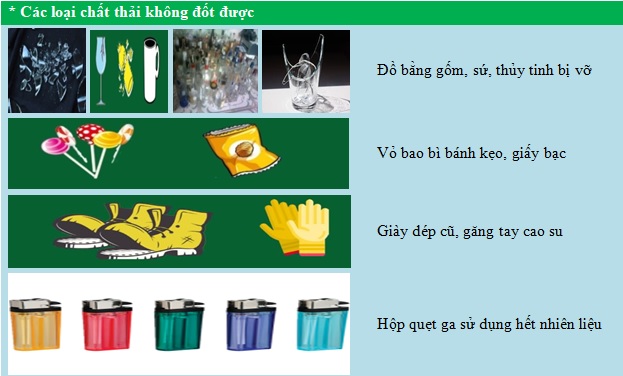 Chất thải không đốt được sau khi phân loại cho vào bao bì đựng chất thải không đốt được, đến khi bao bì đầy thì chuyển giao cho đơn vị thu gom vận chuyển đưa đến nhà máy xử lý chất thải để xử lý bằng phương pháp chôn lấp hợp vệ sinh. Riêng chất thải sắc nhọn như thủy tinh, gương kính vỡ, kéo, dao lam, … để giảm khả năng gây thương tích cho người thu gom chất thải, nên để vào trong bao bì đựng chất thải và có ký hiệu “vật sắc nhọn" để nhận biết.