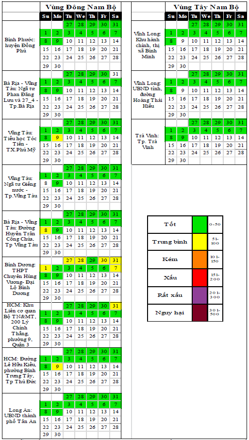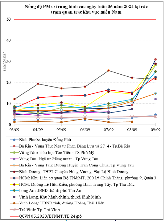 Căn cứ số liệu của 27 trạm quan trắc tự động (QTTĐ) không khí xung quanh, gồm: 07 trạm cố định của quốc gia và 20 trạm cố định của địa phương được sử dụng để tính toán AQI và công bố chất lượng không khí vùng (tổng số 30 trạm, quốc gia có 08 trạm trong đó có 01 trạm cảm biến; địa phương có 22 trạm trong đó có 01 trạm không đủ điều kiện tính AQI, 01 trạm tạm ngưng hoạt động) cho thấy chất lượng môi trường không khí tại khu vực miền Nam tại các Trạm quan trắc thuộc khu vực miền Nam dao động ở mức từ trung bình đến tốt (Trong khoảng thời gian tuần 36 năm 2024 (từ ngày 03/9/2024 đến ngày 09/9/2024). Trong khoảng thời gian tuần 36 năm 2024, 15/27 trạm có dữ liệu không phù hợp công bố thông tin, 12/27 trạm có số liệu đảm bảo chất lượng để tính toán AQI và công bố chất lượng môi trường không khí (trong 12 trạm có: 05 trạm quốc gia, 07 trạm địa phương) của các tỉnh: Bà Rịa – Vũng Tàu, Bình Phước, Bình Dương, Hồ Chí Minh, Long An, Vĩnh Long và Trà Vinh. Giá trị trung bình 01 giờ, trung bình 08 giờ, trung bình 24 giờ của các thông số PM10, PM2.5, NO2, O3, CO và SO2 (các thông số dùng tính toán AQI) tại các trạm về cơ bản vẫn nằm trong giới hạn quy định của QCVN 05:2023/BTNMT. Kết quả cụ thể chất lượng không khí tuần 36 năm 2024 thể hiện tại Biểu đồ 1 và Bảng 1 dưới đây.