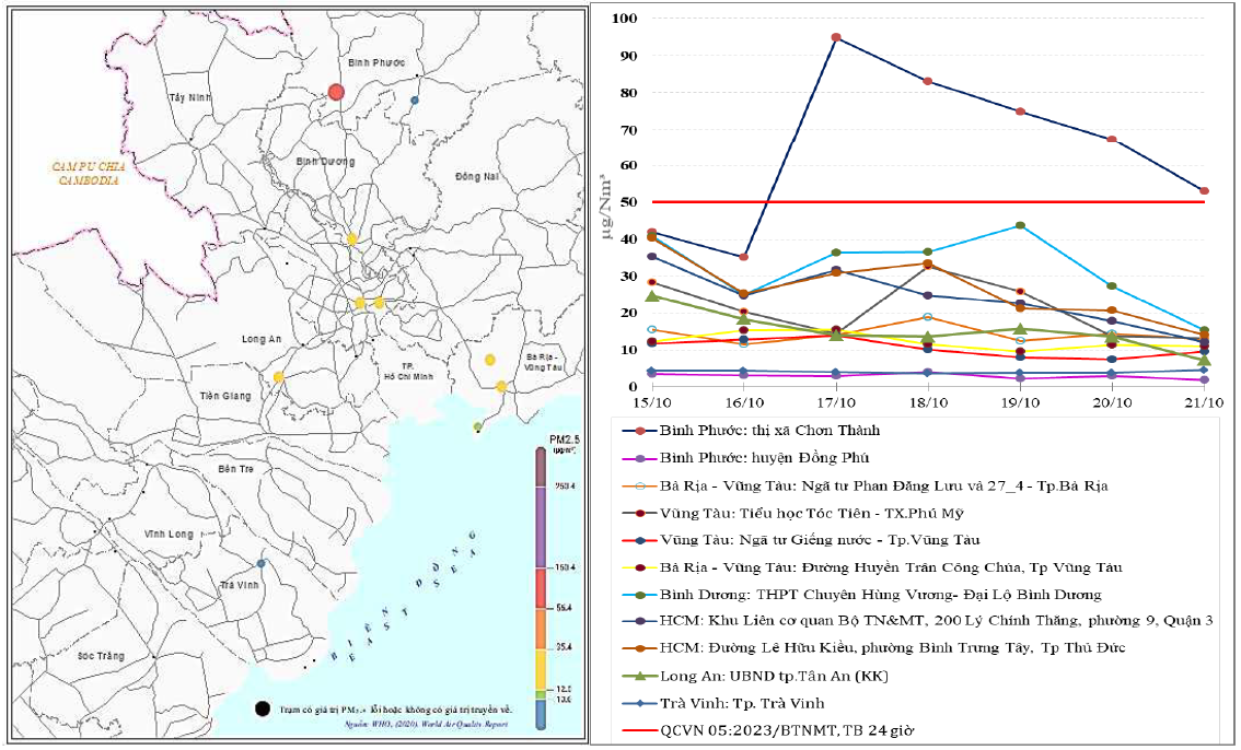 Căn cứ số liệu của 27 trạm quan trắc tự động (QTTĐ) không khí xung quanh, gồm: 07 trạm cố định của quốc gia và 20 trạm cố định của địa phương được sử dụng để tính toán AQI và công bố chất lượng không khí vùng (tổng số 30 trạm, quốc gia có 08 trạm trong đó có 01 trạm cảm biến; địa phương có 22 trạm trong đó có 01 trạm không đủ điều kiện tính AQI, 01 trạm tạm ngưng hoạt động) cho thấy chất lượng môi trường không khí tại khu vực miền Nam tại các Trạm quan trắc thuộc khu vực miền Nam dao động ở mức từ kém đến tốt (từ ngày 15/10/2024 đến ngày 21/10/2024). Trong khoảng thời gian tuần 42 năm 2024, 16/27 trạm có dữ liệu không phù hợp công bố thông tin, 11/27 trạm có số liệu đảm bảo chất lượng để tính toán AQI và công bố chất lượng môi trường không khí (trong 11 trạm có: 05 trạm quốc gia, 06 trạm địa phương) của các tỉnh: Bà Rịa – Vũng Tàu, Bình Phước, Bình Dương, Hồ Chí Minh. Long An và Trà Vinh. Giá trị trung bình 24 giờ thông số PM2.5 trạm thị xã Chơn Thành, tỉnh Bình Phước có 05 lần vượt giới hạn quy định của QCVN 05:2023/BTNMT (chiếm 71,43%). Giá trị trung bình 01 giờ, trung bình 08 giờ, trung bình 24 giờ của các thông số PM10, PM2.5, NO2, O3, CO và SO2 (các thông số dùng tính toán AQI) tại các trạm còn lại về cơ bản vẫn nằm trong giới hạn quy định của QCVN 05:2023/BTNMT, nồng độ các thông số ô nhiễm trong không khí vùng Đông Nam Bộ trong tuần có xu hướng tăng. Kết quả cụ thể chất lượng không khí tuần 42 năm 2024 thể hiện tại Biểu đồ 1 và Bảng 1 dưới đây.