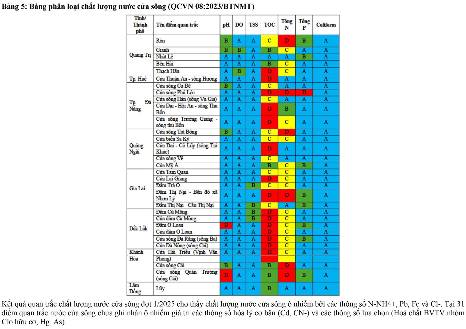 Báo cáo đánh giá tóm tắt chất lượng môi trường không khí và nước đợt 1 năm 2025 được xây dựng trên cơ sở kết quả quan trắc môi trường không khí, nước mặt, nước cửa sông và nước biển ven bờ (đợt 1/2025) do Trung tâm Quan trắc môi trường miền Trung và Tây Nguyên thực hiện. Trong đó, chương trình quan trắc nước mặt (40 điểm) được thực hiện tại LVS Hương, LVS Vu Gia – Thu Bồn và LVS Ba thuộc phạm vi 5 tỉnh/thành phố (Quảng Ngãi, Đà Nẵng, Tp Huế, Gia Lai và Đắk Lắk); chất lượng môi trường nước cửa sông được đánh giá dựa trên kết quả quan trắc tại 31 điểm trên địa bàn 08 tỉnh/thành phố các tỉnh miền Trung và Tây Nguyên; chất lượng môi trường nước biển ven bờ được đánh giá dựa trên kết quả quan trắc tại 22 điểm trên địa bàn 08 tỉnh/thành phố các tỉnh miền Trung và Tây Nguyên và chất lượng môi trường không khí được đánh giá dựa trên kết quả quan trắc tại 36 điểm tại địa bàn thuộc 7 tỉnh/thành phố các tỉnh miền Trung và Tây Nguyên (Quảng Trị, Huế, Đà Nẵng, Quảng Ngãi, Gia Lai, Khánh Hòa, Lâm Đồng).