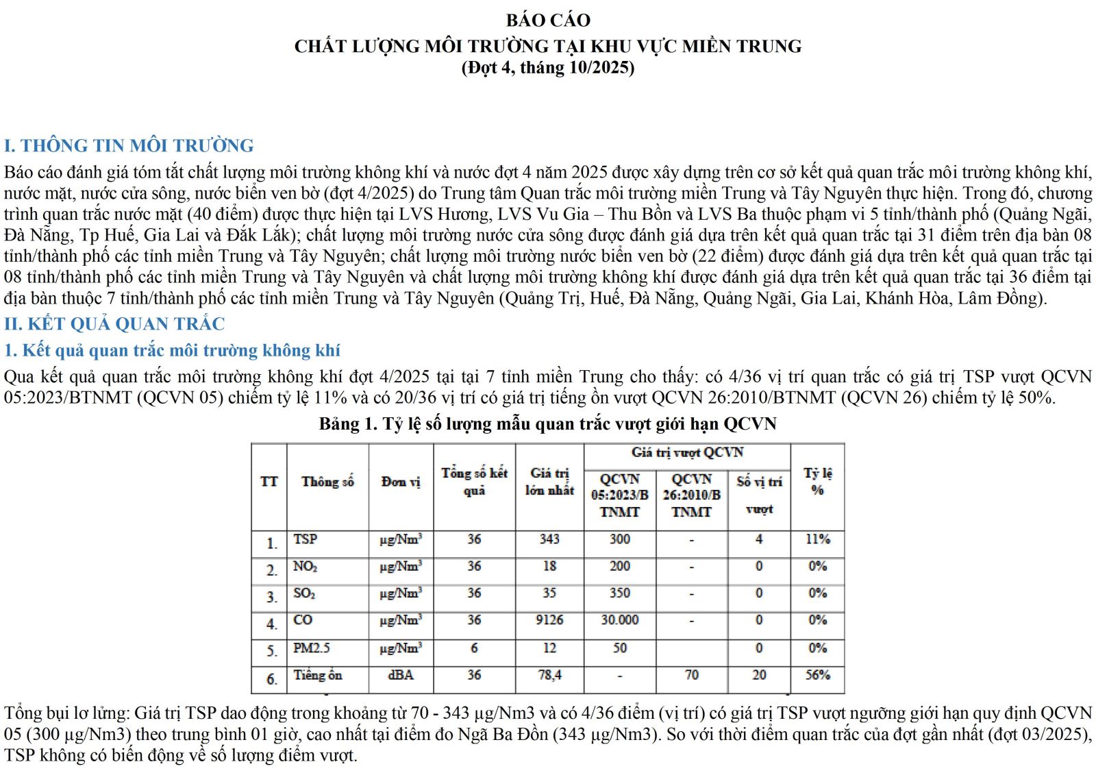 CHẤT LƯỢNG MÔI TRƯỜNG TẠI KHU VỰC MIỀN TRUNG (Đợt 4, tháng 10/2025)