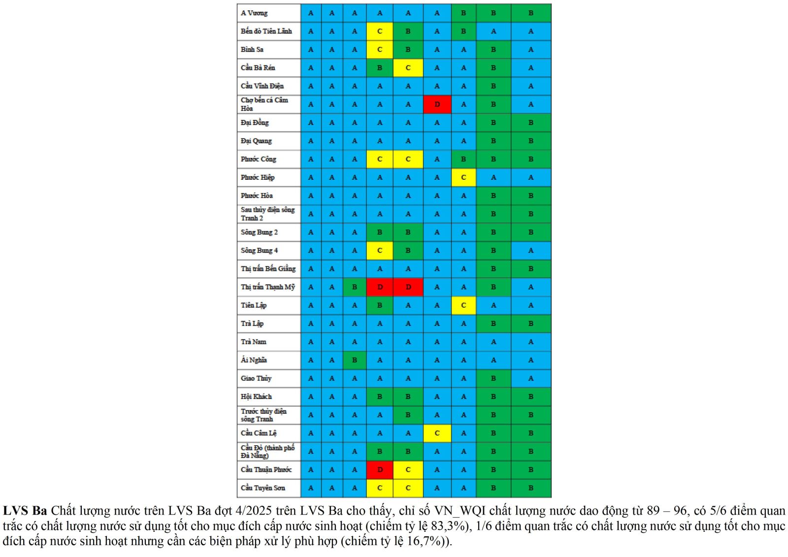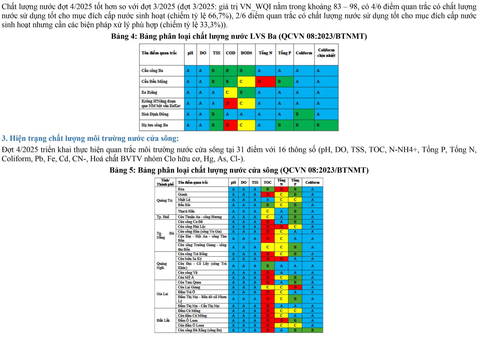 Báo cáo đánh giá tóm tắt chất lượng môi trường không khí và nước đợt 4 năm 2025 được xây dựng trên cơ sở kết quả quan trắc môi trường không khí, nước mặt, nước cửa sông, nước biển ven bờ (đợt 4/2025) do Trung tâm Quan trắc môi trường miền Trung và Tây Nguyên thực hiện. Trong đó, chương trình quan trắc nước mặt (40 điểm) được thực hiện tại LVS Hương, LVS Vu Gia – Thu Bồn và LVS Ba thuộc phạm vi 5 tỉnh/thành phố (Quảng Ngãi, Đà Nẵng, Tp Huế, Gia Lai và Đắk Lắk); chất lượng môi trường nước cửa sông được đánh giá dựa trên kết quả quan trắc tại 31 điểm trên địa bàn 08 tỉnh/thành phố các tỉnh miền Trung và Tây Nguyên; chất lượng môi trường nước biển ven bờ (22 điểm) được đánh giá dựa trên kết quả quan trắc tại 08 tỉnh/thành phố các tỉnh miền Trung và Tây Nguyên và chất lượng môi trường không khí được đánh giá dựa trên kết quả quan trắc tại 36 điểm tại địa bàn thuộc 7 tỉnh/thành phố các tỉnh miền Trung và Tây Nguyên (Quảng Trị, Huế, Đà Nẵng, Quảng Ngãi, Gia Lai, Khánh Hòa, Lâm Đồng)