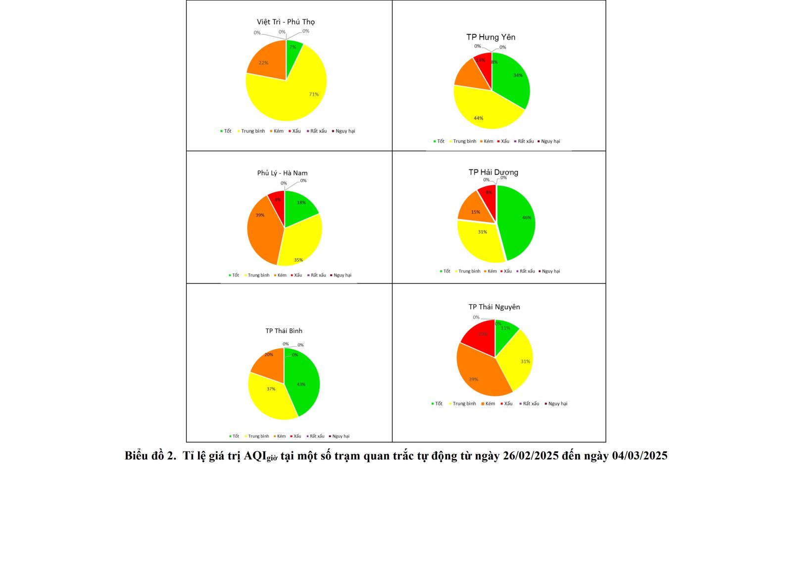 Kết quả quan trắc tại các trạm quan trắc tự động tại khu vực phía Bắc từ ngày 26/02 đến ngày 04/03 cho thấy chỉ số AQIngày ở mức xấu tại các trạm: Bách Khoa - Hà Nội, TP Hưng Yên, Phủ Lý - Hà Nam, TP Thái Nguyên, 556 Nguyễn Văn Cừ.