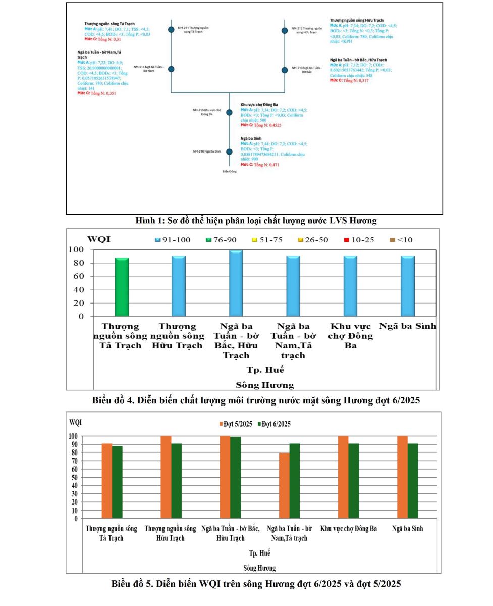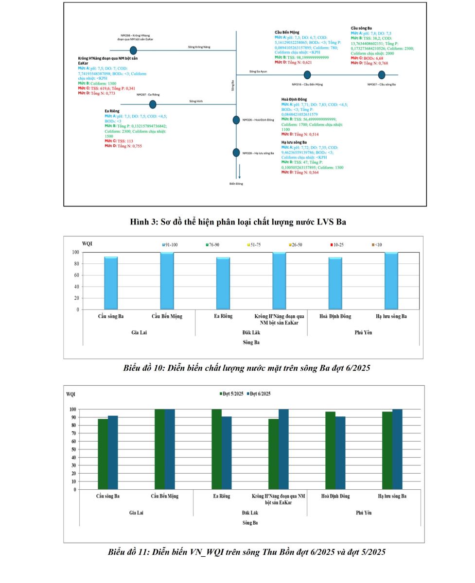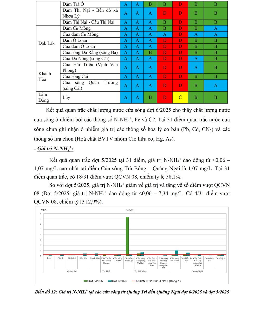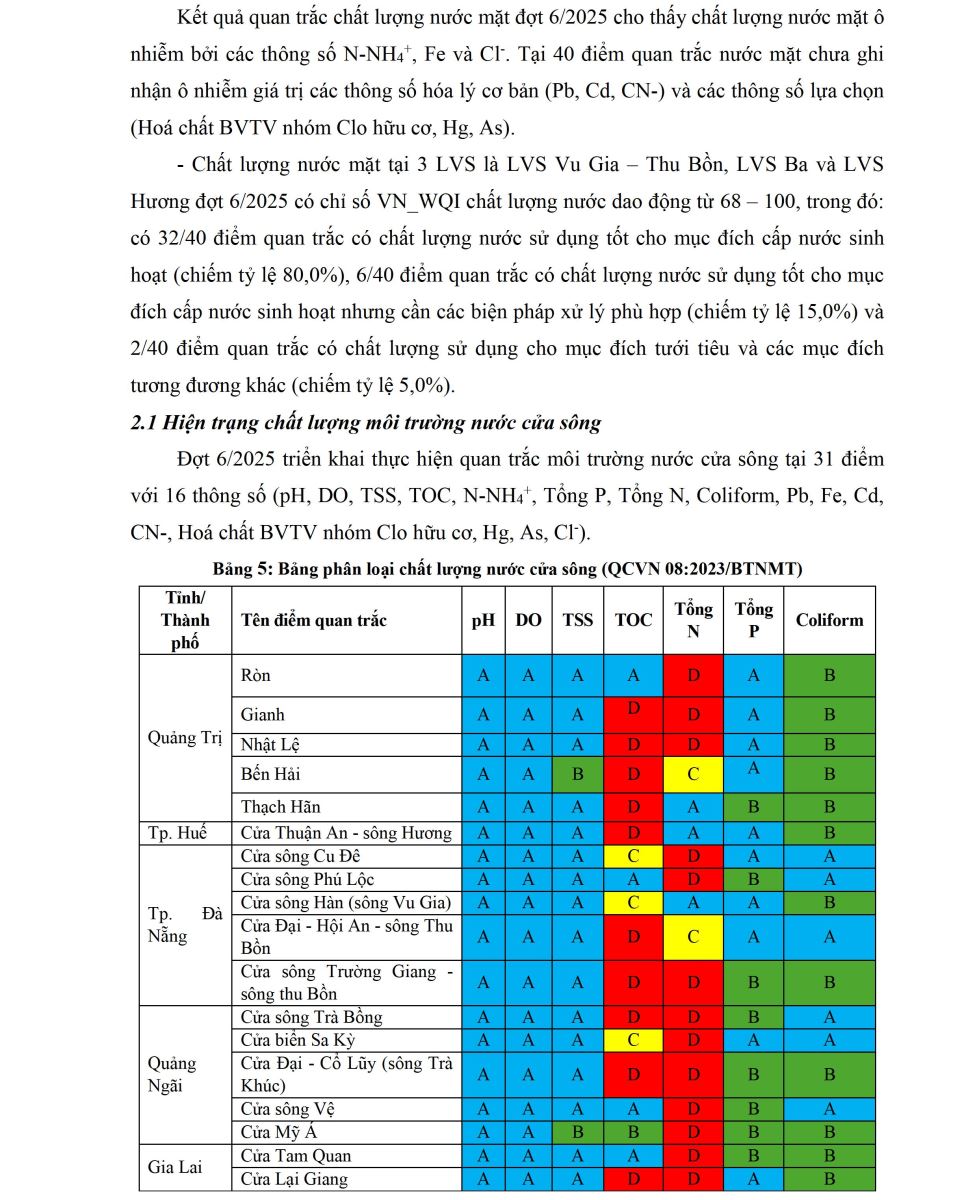 Báo cáo đánh giá tóm tắt chất lượng môi trường không khí và nước đợt 6 năm 2025 được xây dựng trên cơ sở kết quả quan trắc môi trường không khí, nước mặt, nước cửa sông, nước biển ven bờ (đợt 6/2025) do Trung tâm Quan trắc môi trường miền Trung và Tây Nguyên thực hiện. Trong đó, chương trình quan trắc nước mặt (40 điểm) được thực hiện tại LVS Hương, LVS Vu Gia – Thu Bồn và LVS Ba thuộc phạm vi 5 tỉnh/thành phố (Quảng Ngãi, Đà Nẵng, Tp Huế, Gia Lai và Đắk Lắk); chất lượng môi trường nước cửa sông được đánh giá dựa trên kết quả quan trắc tại 31 điểm trên địa bàn 08 tỉnh/thành phố các tỉnh miền Trung và Tây Nguyên; chất lượng môi trường nước biển ven bờ (22 điểm) được đánh giá dựa trên kết quả quan trắc tại 08 tỉnh/thành phố các tỉnh miền Trung và Tây Nguyên và chất lượng môi trường không khí được đánh giá dựa trên kết quả quan trắc tại 36 điểm tại địa bàn thuộc 7 tỉnh/thành phố các tỉnh miền Trung và Tây Nguyên (Quảng Trị, Huế, Đà Nẵng, Quảng Ngãi, Gia Lai, Khánh Hòa, Lâm Đồng).