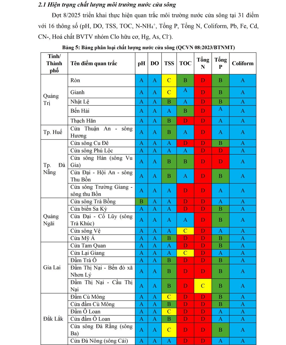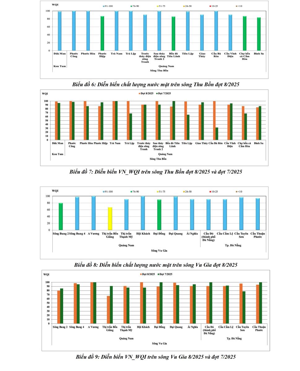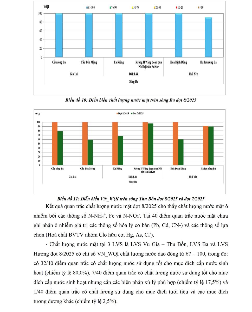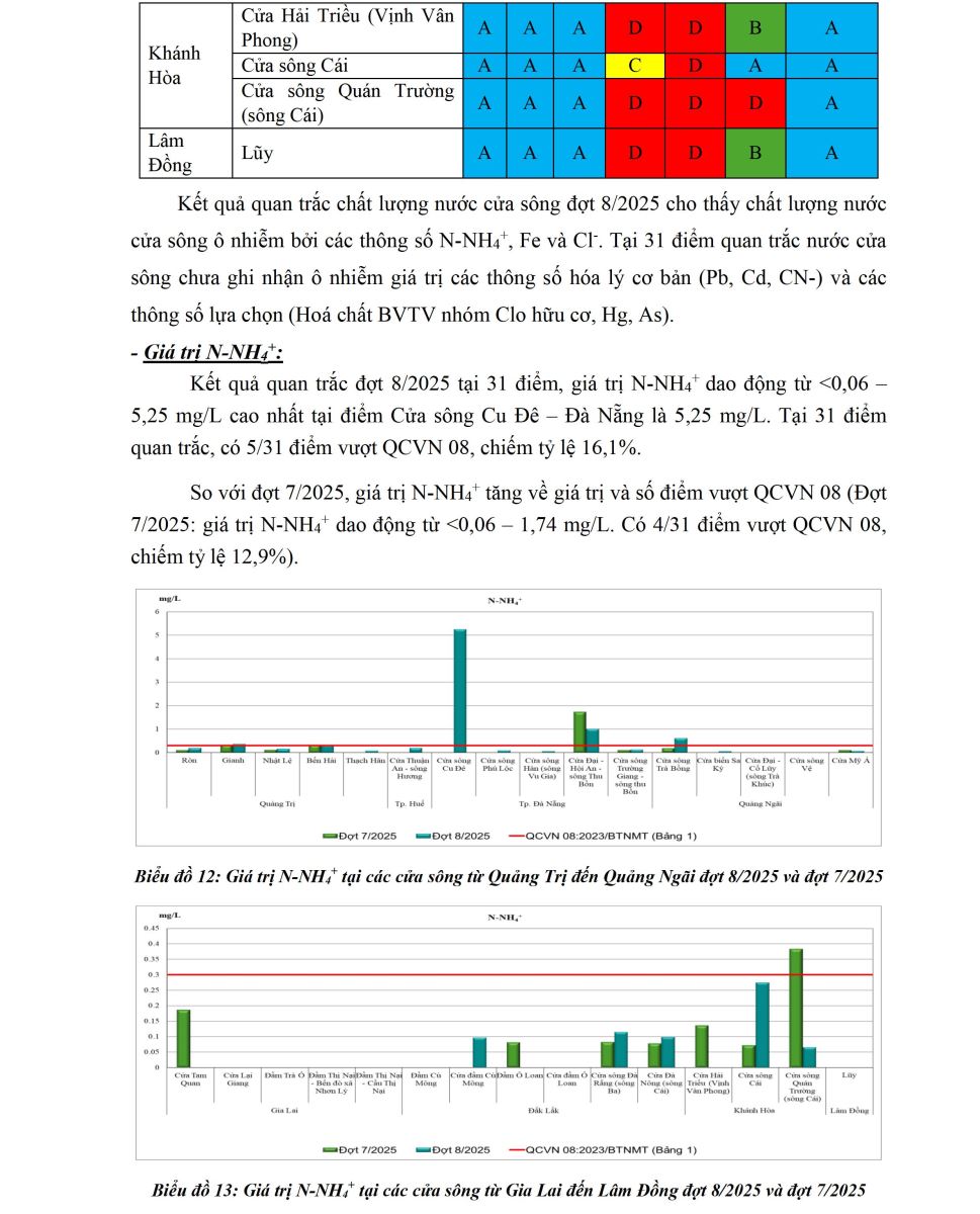 Báo cáo đánh giá tóm tắt chất lượng môi trường không khí và nước đợt 7 năm 2025 được xây dựng trên cơ sở kết quả quan trắc môi trường không khí, nước mặt, nước cửa sông, nước biển ven bờ (đợt 7/2025) do Trung tâm Quan trắc môi trường miền Trung và Tây Nguyên thực hiện. Trong đó, chương trình quan trắc nước mặt (40 điểm) được thực hiện tại LVS Hương, LVS Vu Gia – Thu Bồn và LVS Ba thuộc phạm vi 5 tỉnh/thành phố (Quảng Ngãi, Đà Nẵng, Tp Huế, Gia Lai và Đắk Lắk); chất lượng môi trường nước cửa sông được đánh giá dựa trên kết quả quan trắc tại 31 điểm trên địa bàn 08 tỉnh/thành phố các tỉnh miền Trung và Tây Nguyên.