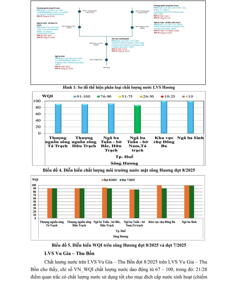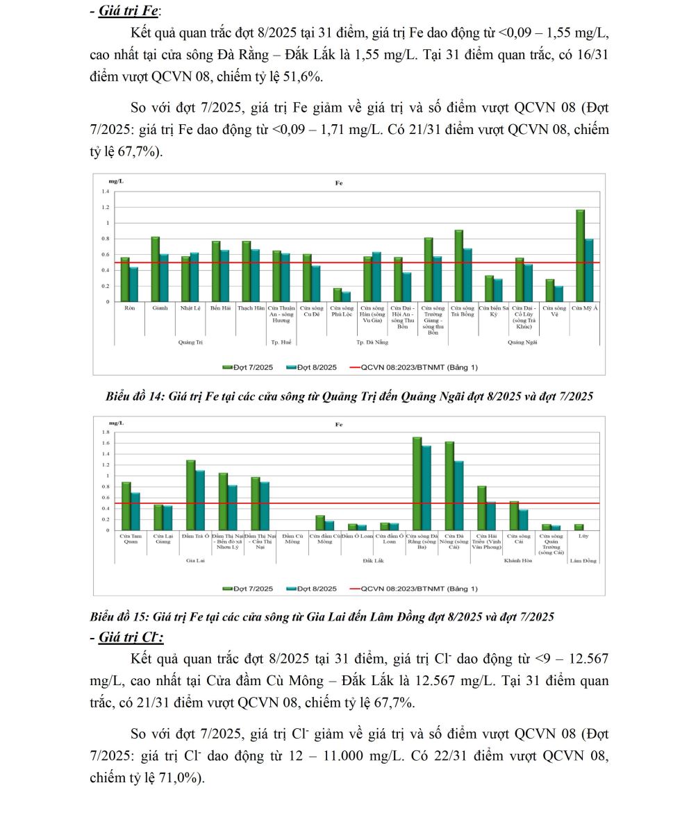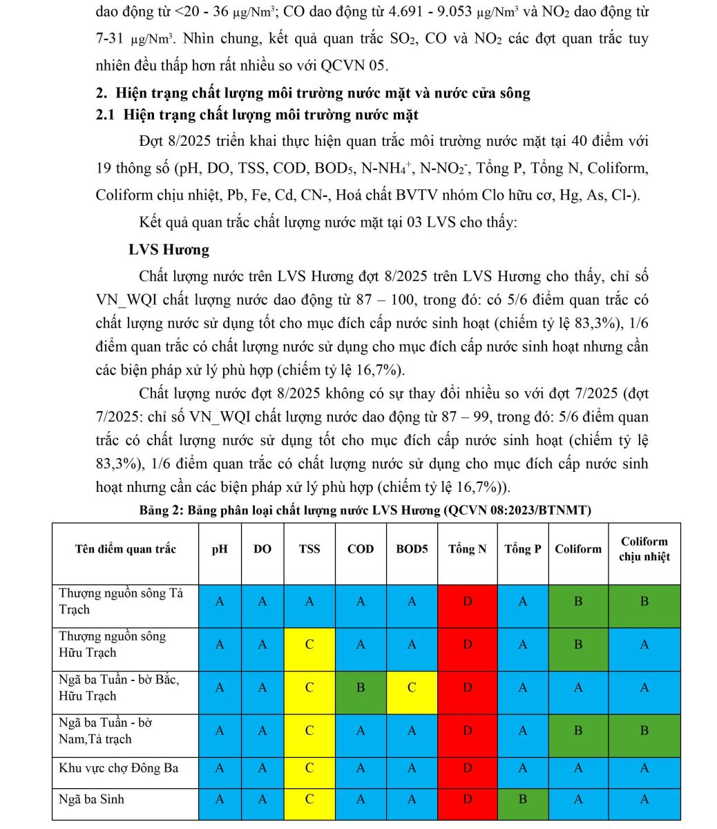 Báo cáo đánh giá tóm tắt chất lượng môi trường không khí và nước đợt 7 năm 2025 được xây dựng trên cơ sở kết quả quan trắc môi trường không khí, nước mặt, nước cửa sông, nước biển ven bờ (đợt 7/2025) do Trung tâm Quan trắc môi trường miền Trung và Tây Nguyên thực hiện. Trong đó, chương trình quan trắc nước mặt (40 điểm) được thực hiện tại LVS Hương, LVS Vu Gia – Thu Bồn và LVS Ba thuộc phạm vi 5 tỉnh/thành phố (Quảng Ngãi, Đà Nẵng, Tp Huế, Gia Lai và Đắk Lắk); chất lượng môi trường nước cửa sông được đánh giá dựa trên kết quả quan trắc tại 31 điểm trên địa bàn 08 tỉnh/thành phố các tỉnh miền Trung và Tây Nguyên.