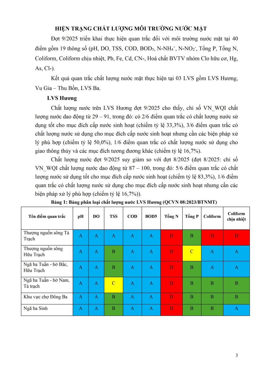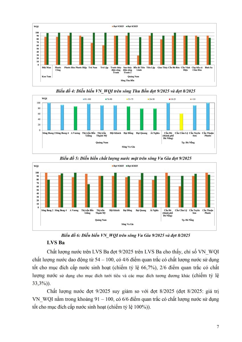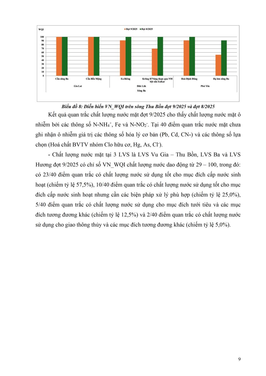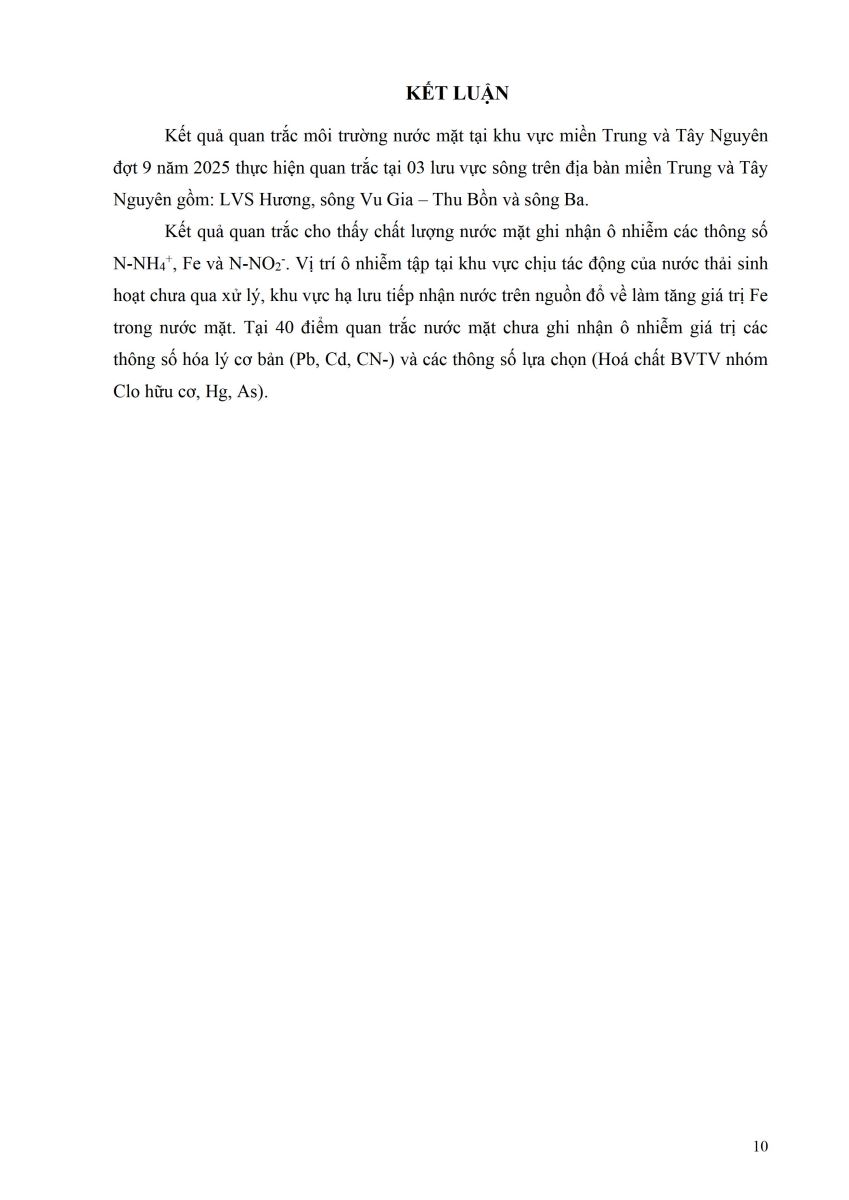 Báo cáo đánh giá tóm tắt chất lượng môi trường nước đợt 9 năm 2025 được xây dựng trên cơ sở kết quả quan trắc môi trường nước mặt do Trung tâm Quan trắc môi trường miền Trung và Tây Nguyên thực hiện. Trong đó, chương trình quan trắc nước mặt (40 điểm) được thực hiện tại LVS Hương, LVS Vu Gia – Thu Bồn và LVS Ba thuộc phạm vi 5 tỉnh/thành phố (Quảng Ngãi, Đà Nẵng, Tp Huế, Gia Lai và Đắk Lắk).
