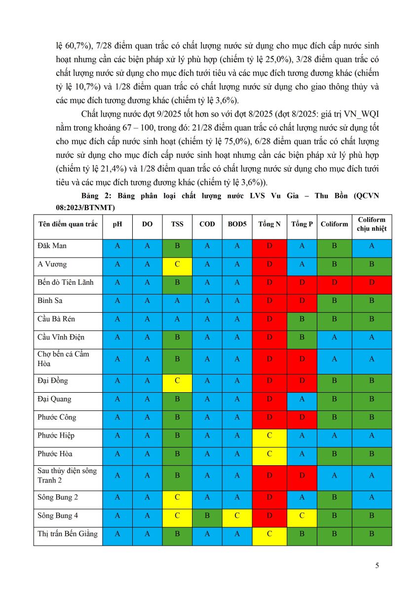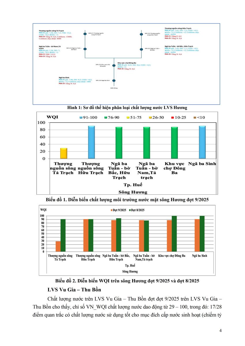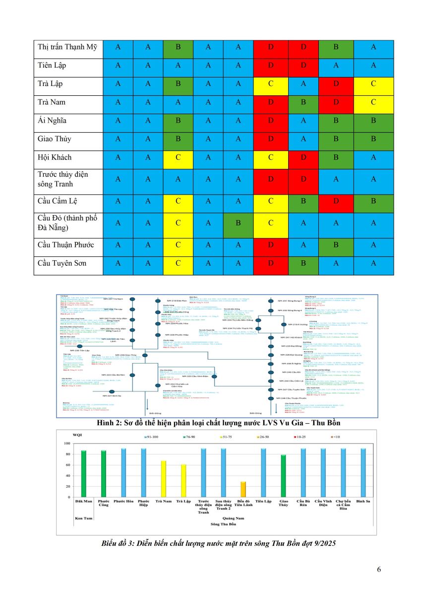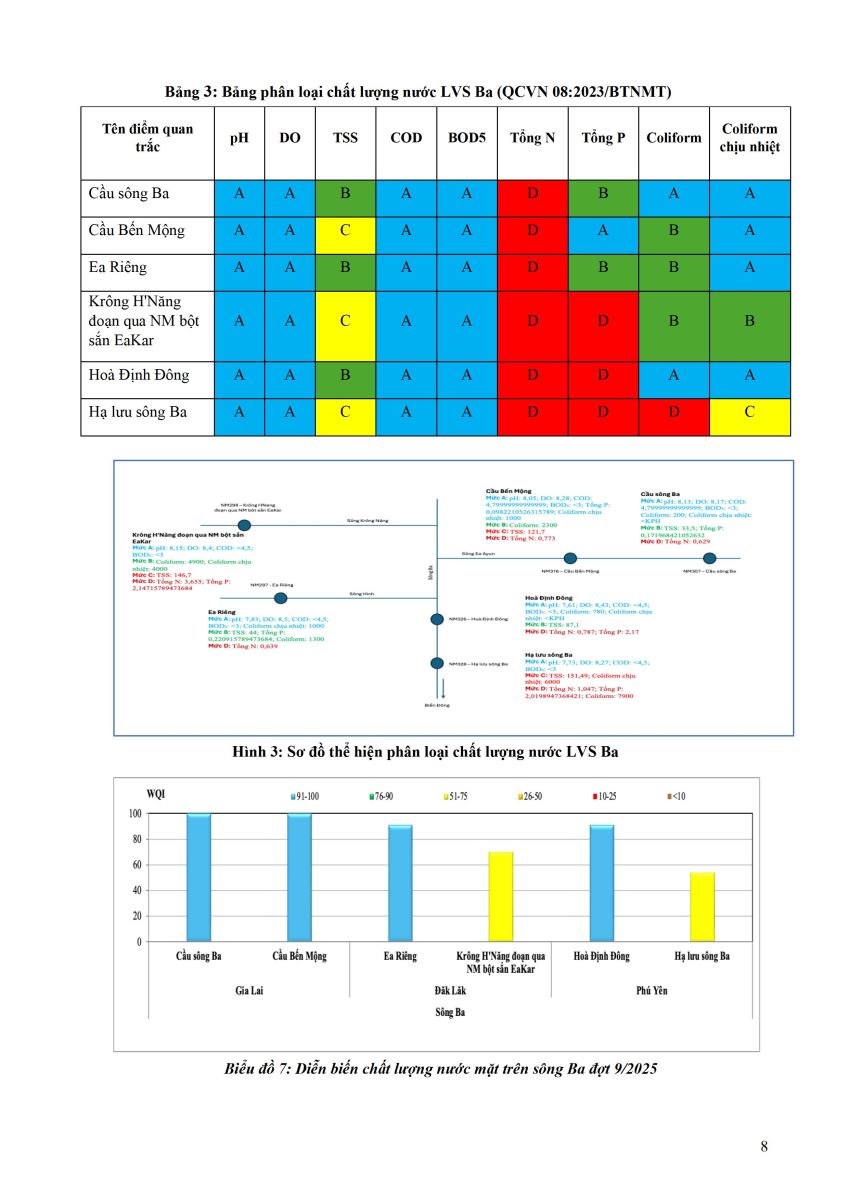 Báo cáo đánh giá tóm tắt chất lượng môi trường nước đợt 9 năm 2025 được xây dựng trên cơ sở kết quả quan trắc môi trường nước mặt do Trung tâm Quan trắc môi trường miền Trung và Tây Nguyên thực hiện. Trong đó, chương trình quan trắc nước mặt (40 điểm) được thực hiện tại LVS Hương, LVS Vu Gia – Thu Bồn và LVS Ba thuộc phạm vi 5 tỉnh/thành phố (Quảng Ngãi, Đà Nẵng, Tp Huế, Gia Lai và Đắk Lắk).