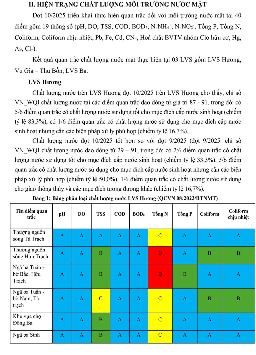 Đợt 10/2025 triển khai thực hiện quan trắc đối với môi trường nước mặt tại 40 điểm gồm 19 thông số (pH, DO, TSS, COD, BOD5, N-NH4+, N-NO2-, Tổng P, Tổng N, Coliform, Coliform chịu nhiệt, Pb, Fe, Cd, CN-, Hoá chất BVTV nhóm Clo hữu cơ, Hg, As, Cl-).