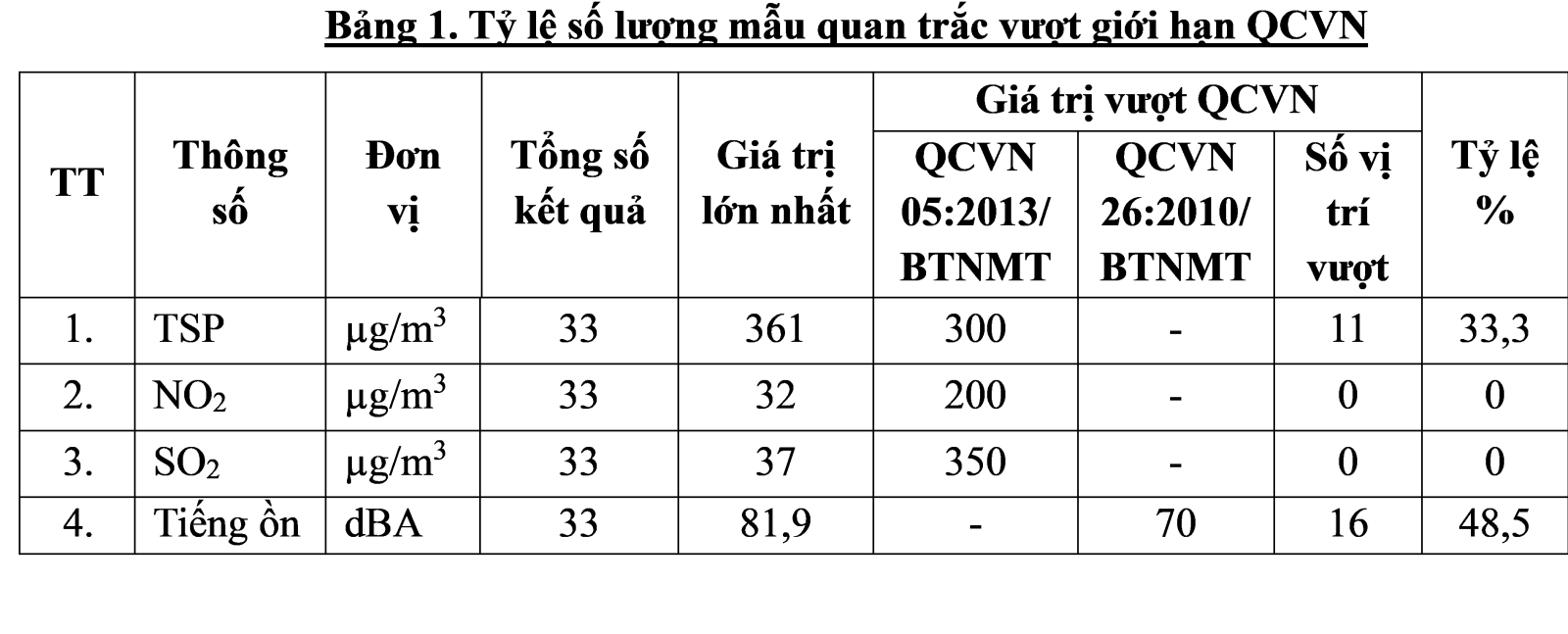 Hiện trạng chất lượng môi trường không khí: có 11/33 điểm có giá trị TSP vượt QCVN 05:2013/BTNMT (QCVN 05) chiếm tỷ lệ 33,3% và 16/33 điểm có giá trị tiếng ồn vượt QCVN 26:2010/BTNMT (QCVN 26) chiếm tỷ lệ 48,5%.