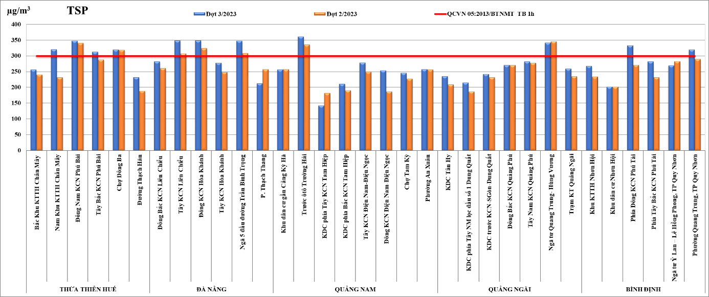 Giá trị TSP dao động trong khoảng từ 142 - 361 µg/m3 và có 11/33 điểm có giá trị TSP vượt ngưỡng giới hạn quy định của QCVN 05 (300 µg/m3) theo trung bình 01 giờ, cao nhất tại điểm đo trước ô tô Trường Hải (361 µg/m3).