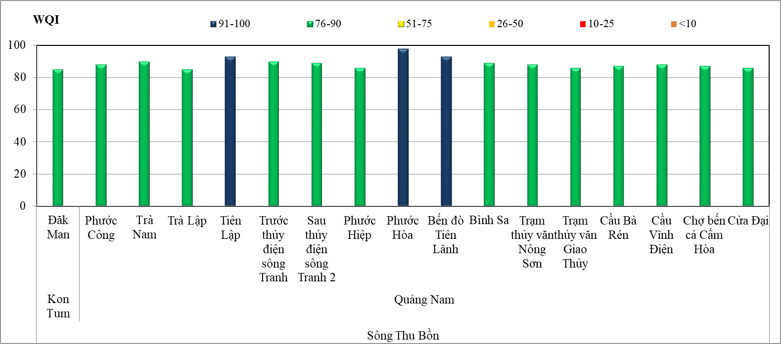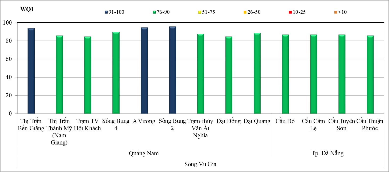 Trong đó, chất lượng nước trên LVS Hương đợt 3/2023 có giá trị VN_WQI nằm trong khoảng 86 – 91, trong khi chất lượng nước trên LVS Vu Gia – Thu Bồn có giá trị VN_WQI nằm trong khoảng 85 – 98.
