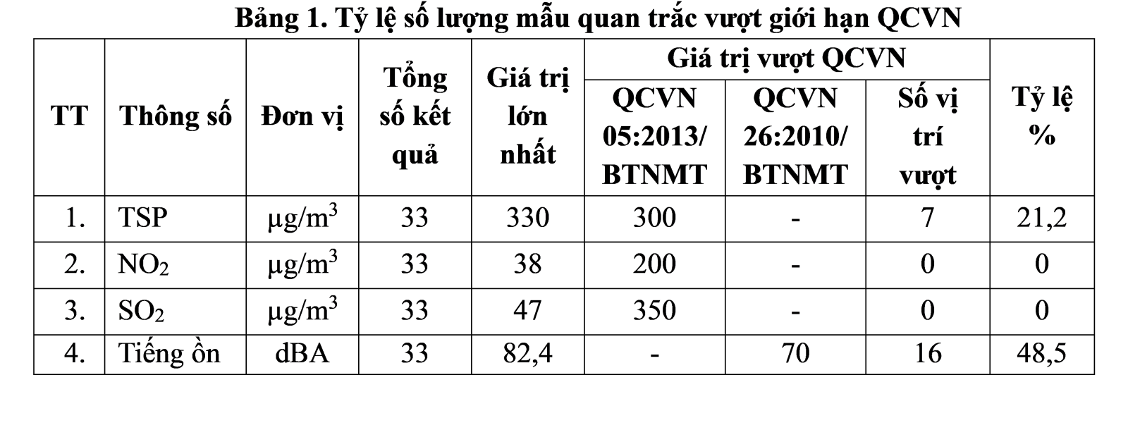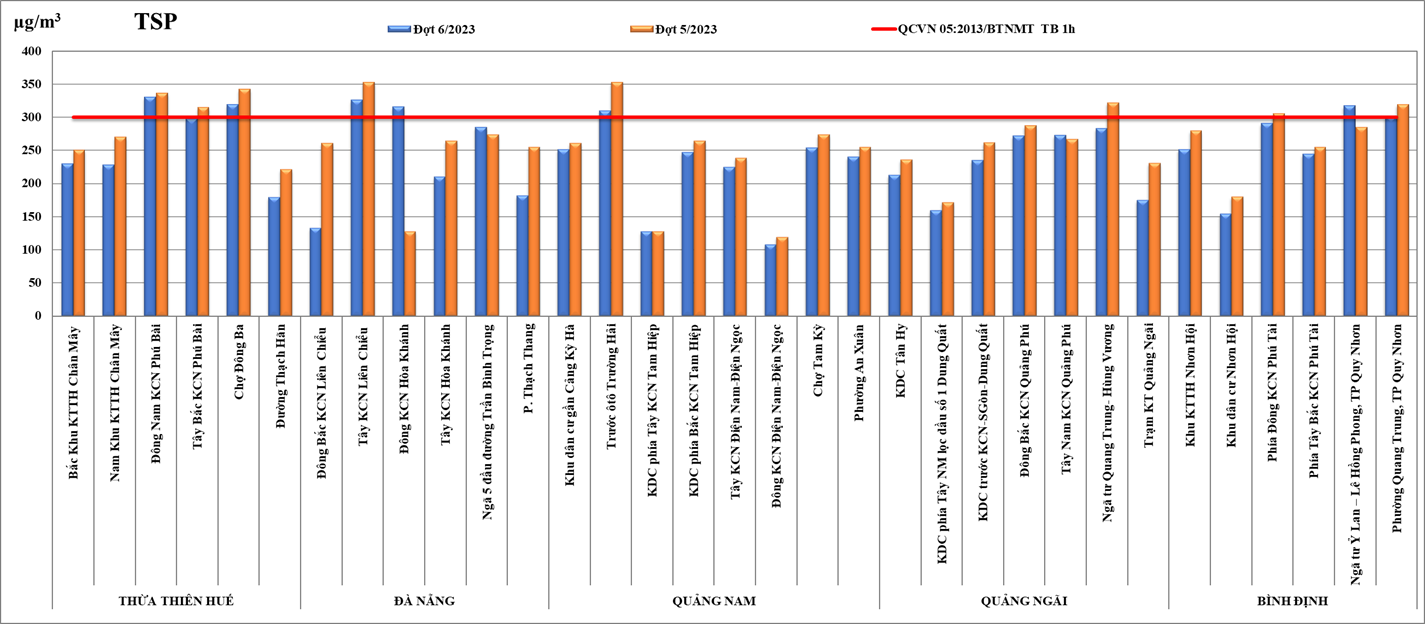 Giá trị TSP dao động trong khoảng từ 108 - 330 µg/m3 và có 7/33 điểm (vị trí) có giá trị TSP vượt ngưỡng giới hạn quy định của QCVN 05 (300 µg/m3) theo trung bình 01 giờ, cao nhất tại điểm đo Đông Nam KCN Phú Bài (330 µg/m3).