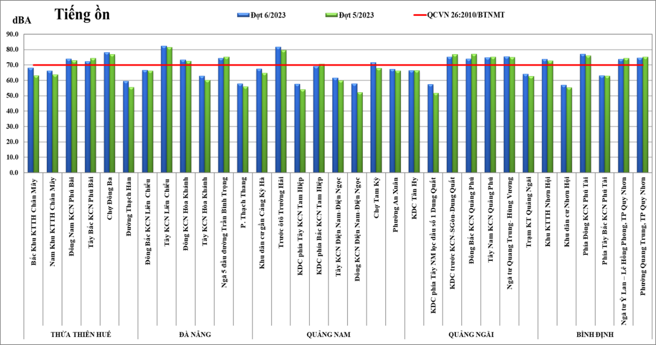 Kết quả quan trắc đợt 6/2023 cho thấy giá trị tiếng ồn dao động trong khoảng từ 56,9 - 82,4 dBA, cao nhất tại điểm đo Tây KCN Liên Chiểu có giá trị là 82,4 dBA và có 16/33 điểm (vị trí) vượt QCVN 26 (70 dBA, áp dụng với khung thời gian từ 6 giờ đến 21 giờ, cho khu vực thông thường) chiếm tỷ lệ 48,5%.
