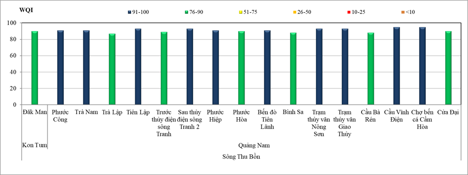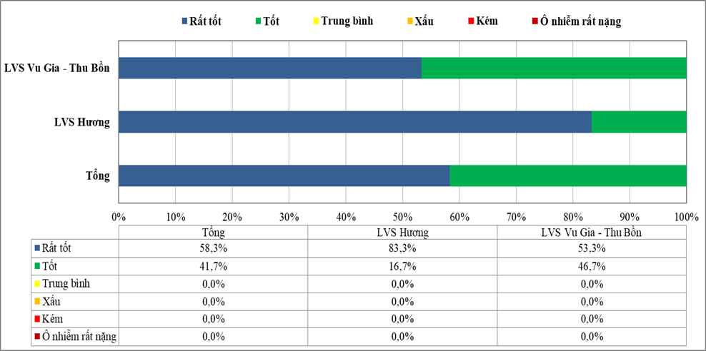 Trong đó, chất lượng nước trên LVS Hương đợt 6/2023 có giá trị VN_WQI nằm trong khoảng 90 – 95, chất lượng nước trên LVS Vu Gia – Thu Bồn 5/2023 đợt 6/2023 có giá trị VN_WQI nằm trong khoảng 86 – 96.